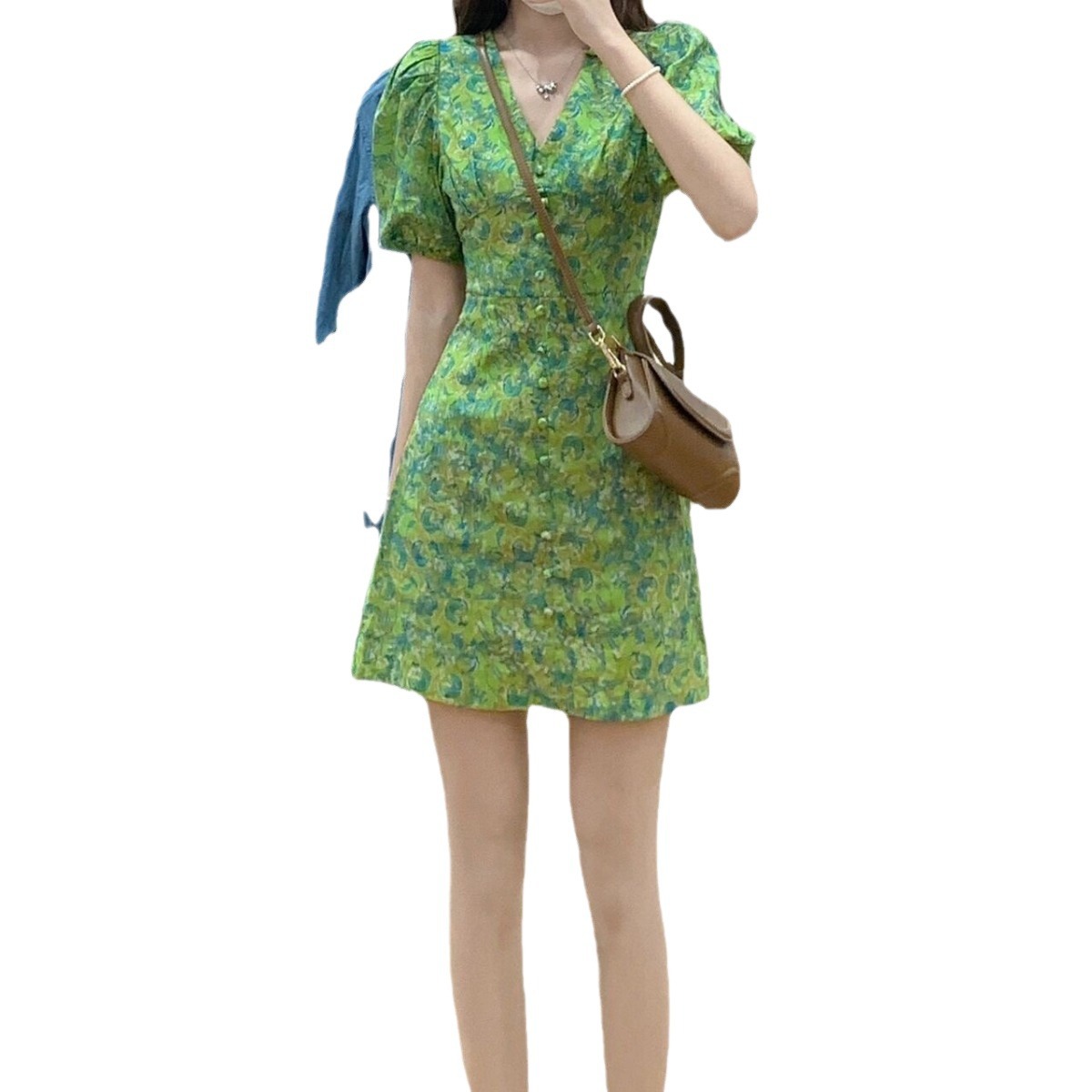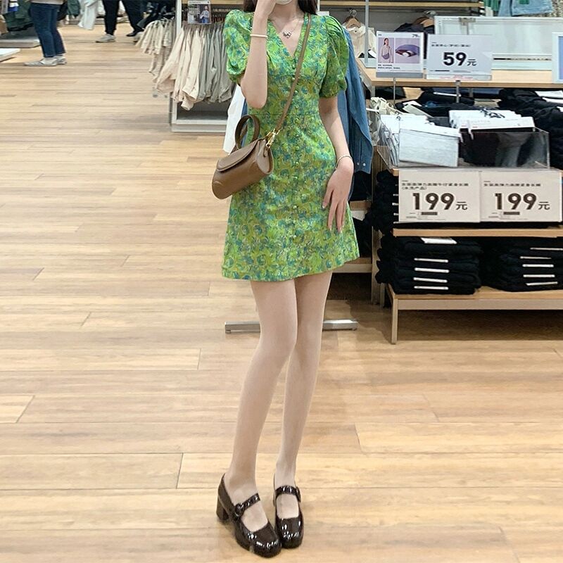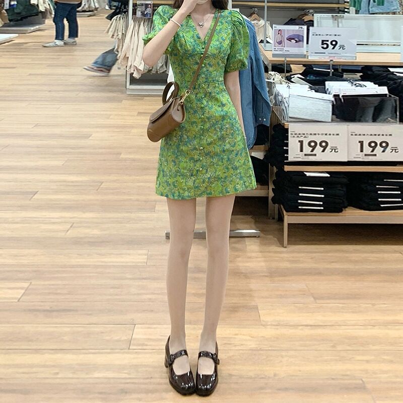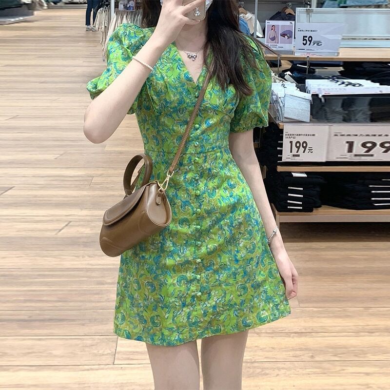 新款夏季法式洋气小个子减龄小清新甜美泡泡袖碎花连衣裙子女