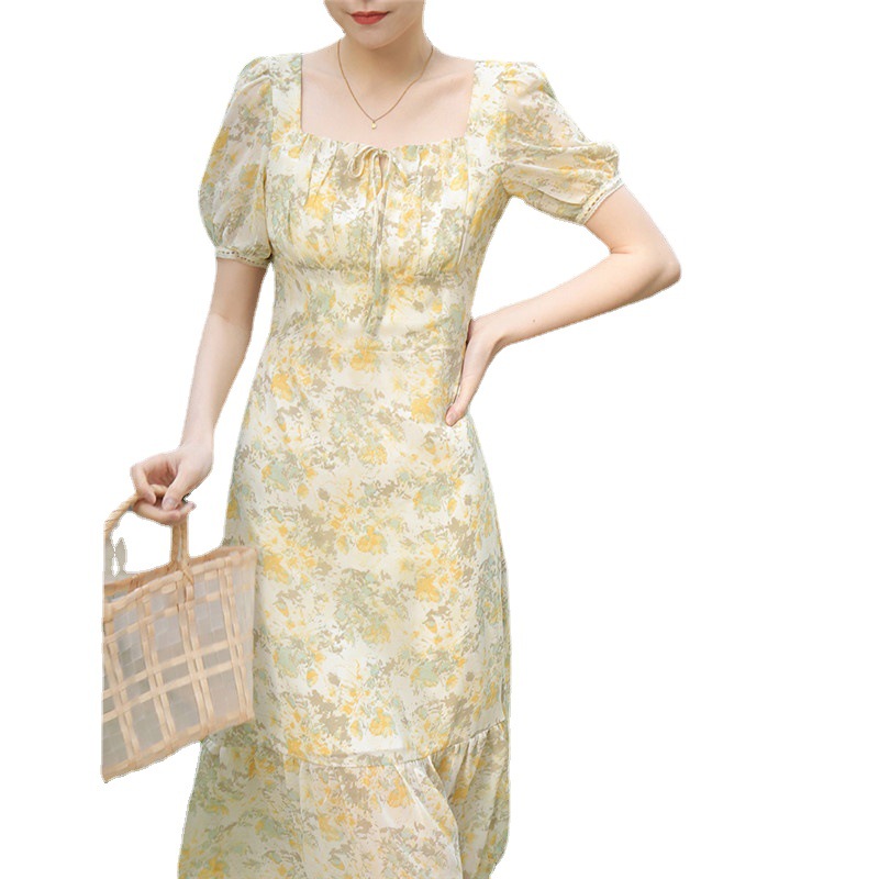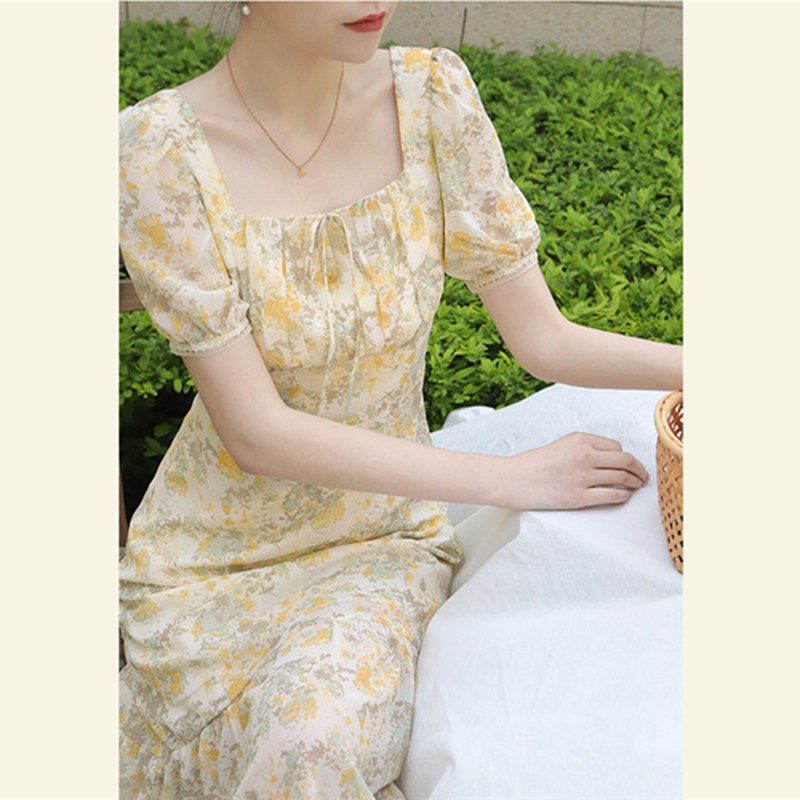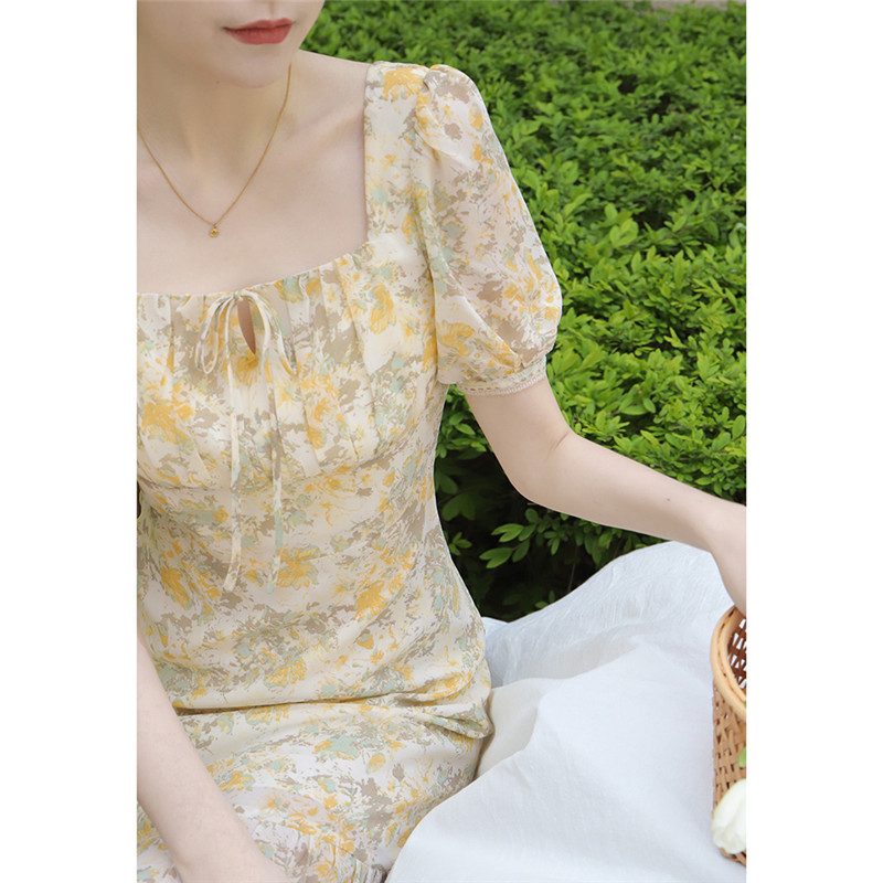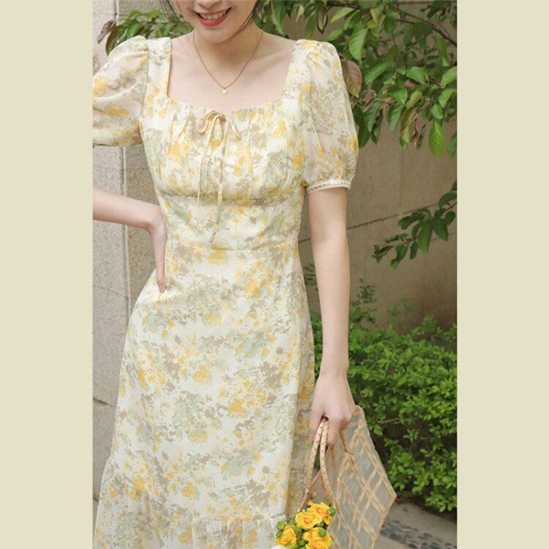 年新款法式超仙女森系中长款黄色泡泡袖碎花方领连衣裙子夏季