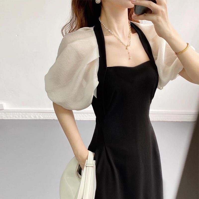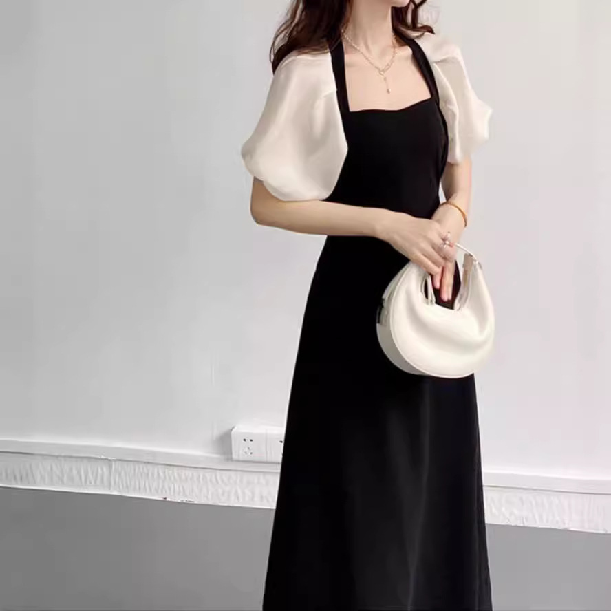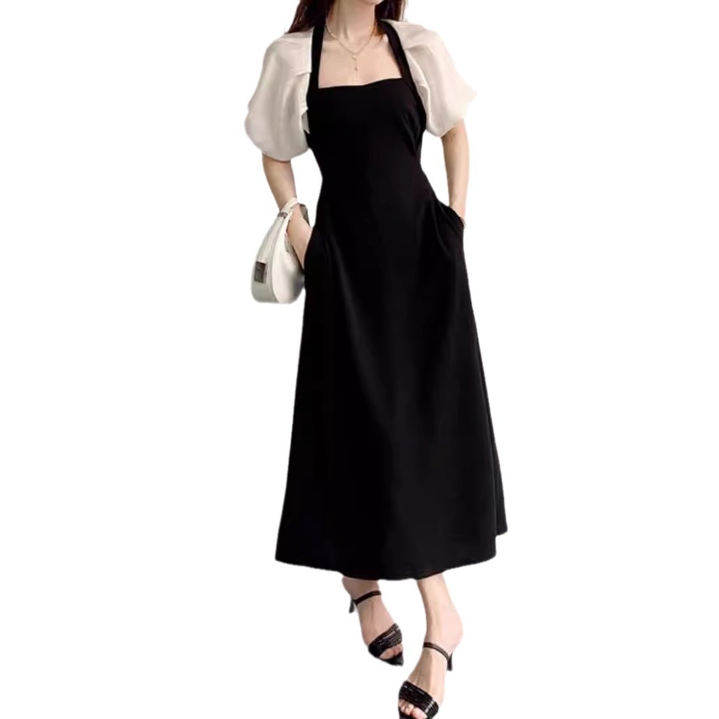 法式复古初恋小香风显瘦长裙气质赫本风泡泡袖黑色方领连衣裙夏季