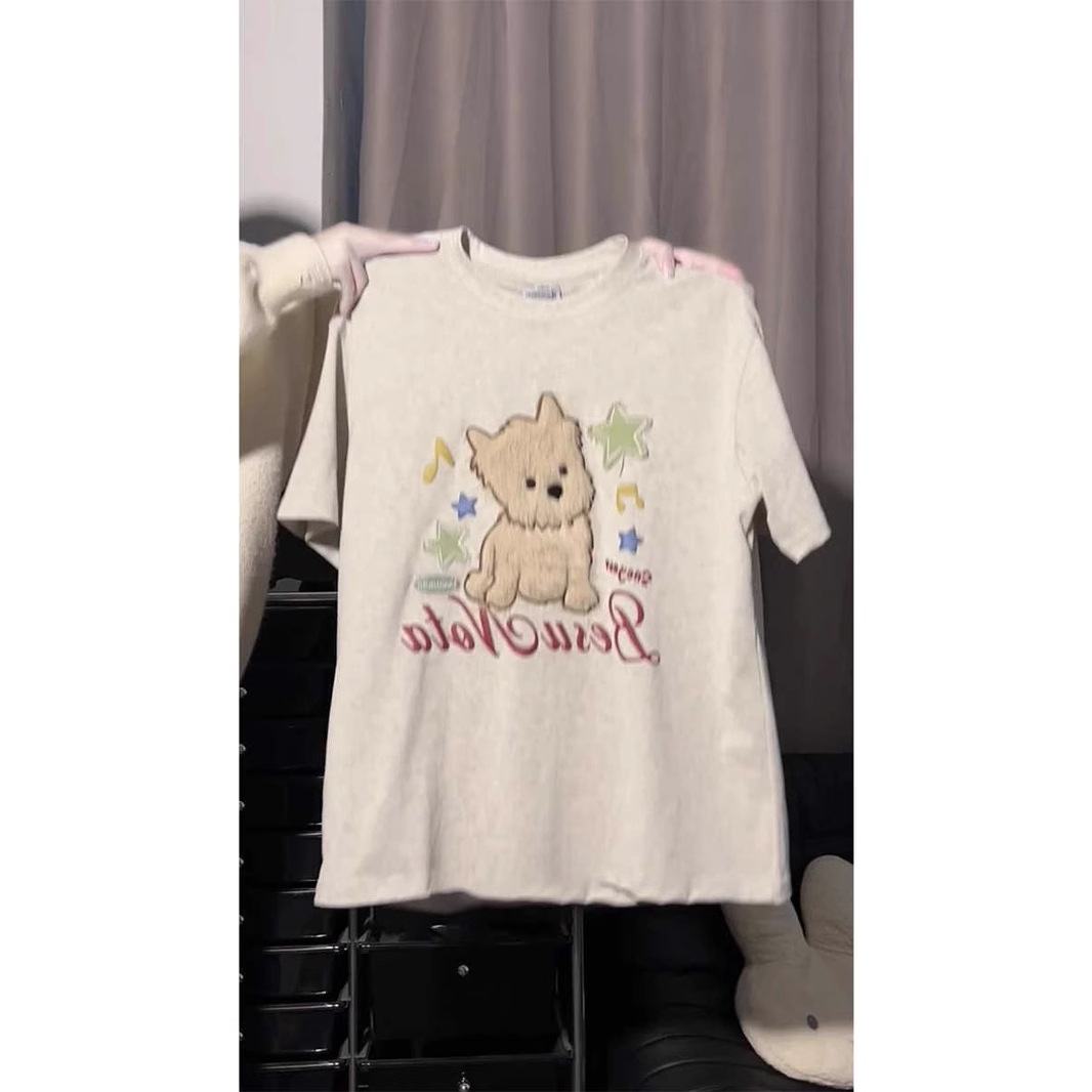 美式可爱毛绒小狗重磅短袖t恤女夏季慵懒风宽松显瘦ins半袖上衣潮