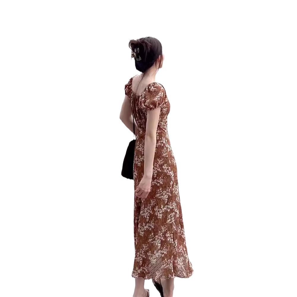夏季新款雪纺碎花连衣裙子气质显瘦海边度假泡泡袖V领沙滩裙