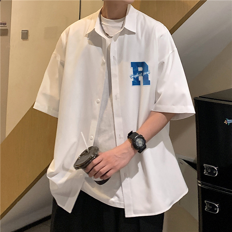 冰丝短袖衬衫男生夏季美式潮牌潮流痞帅设计感休闲白衬衣半袖