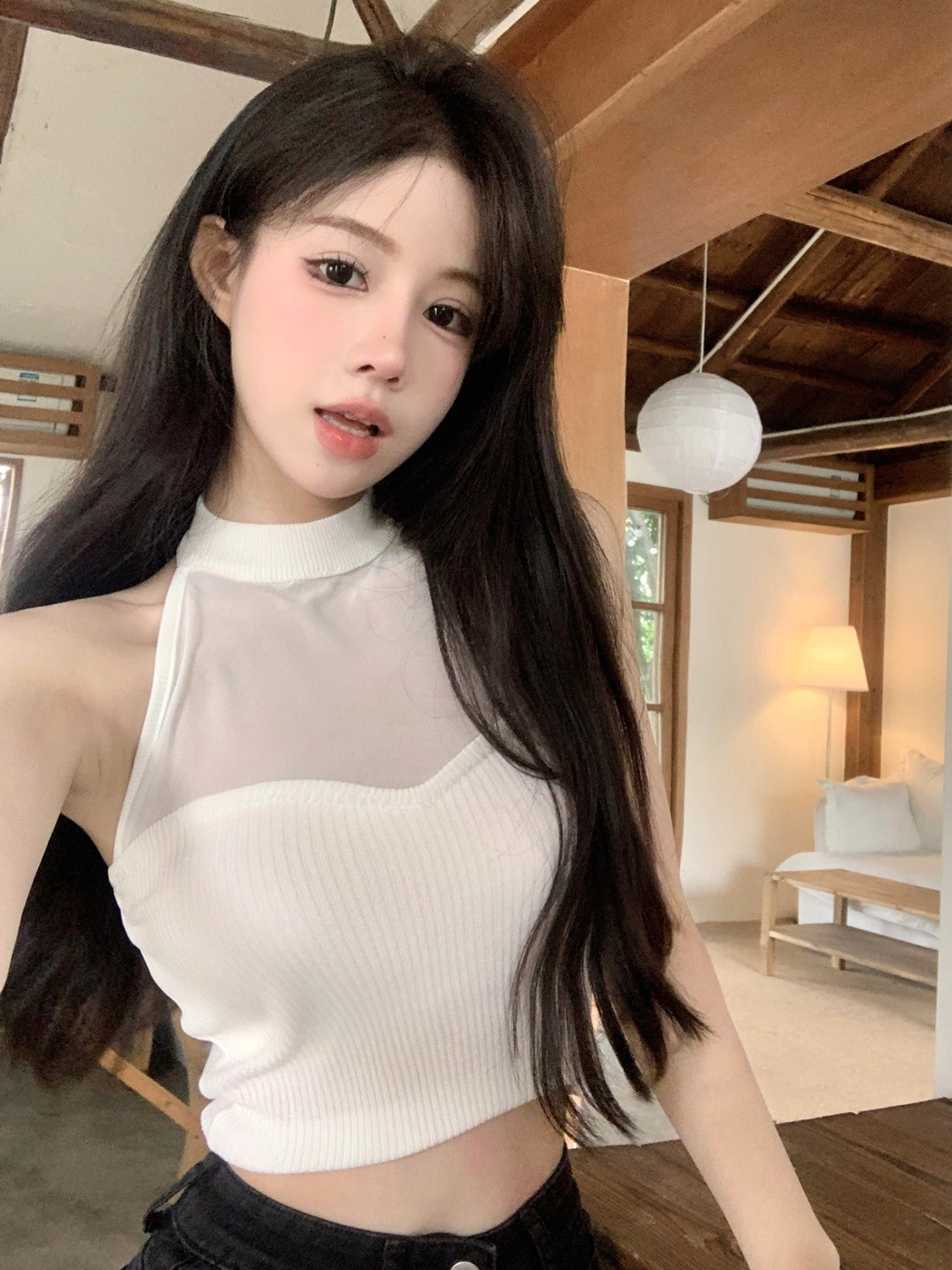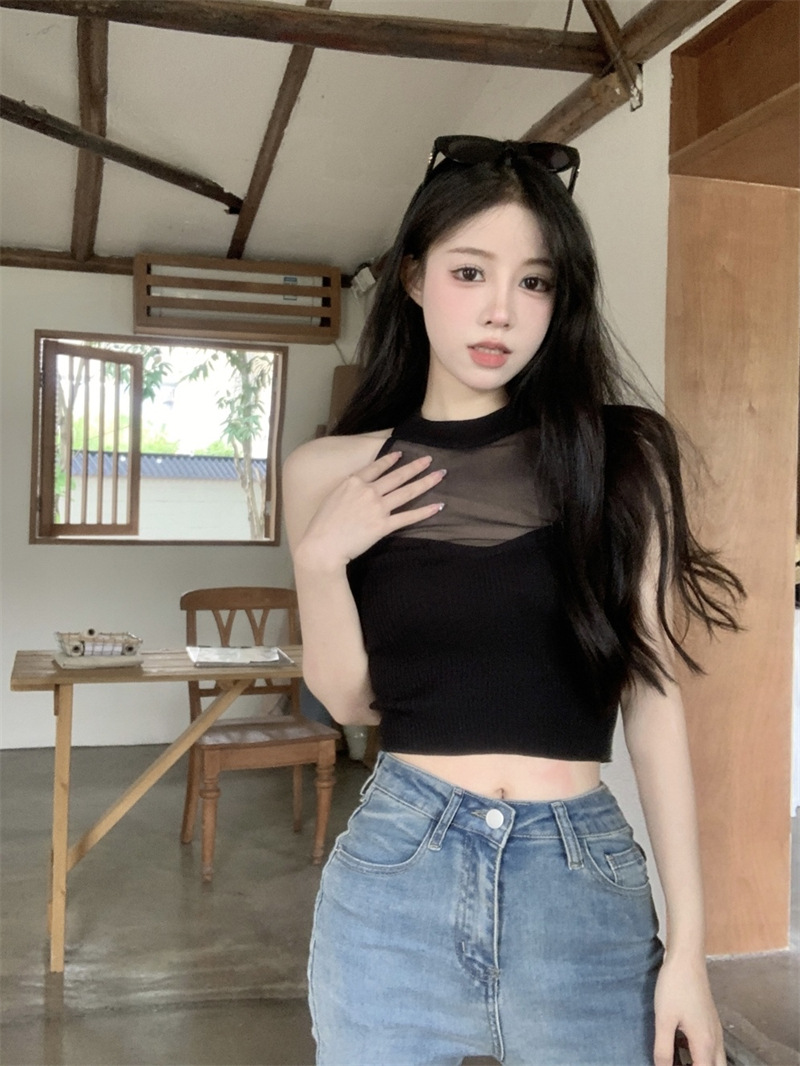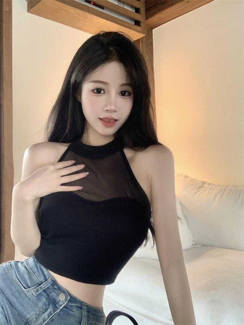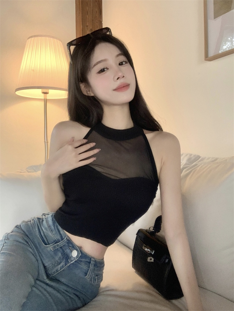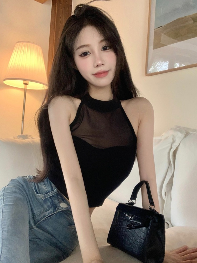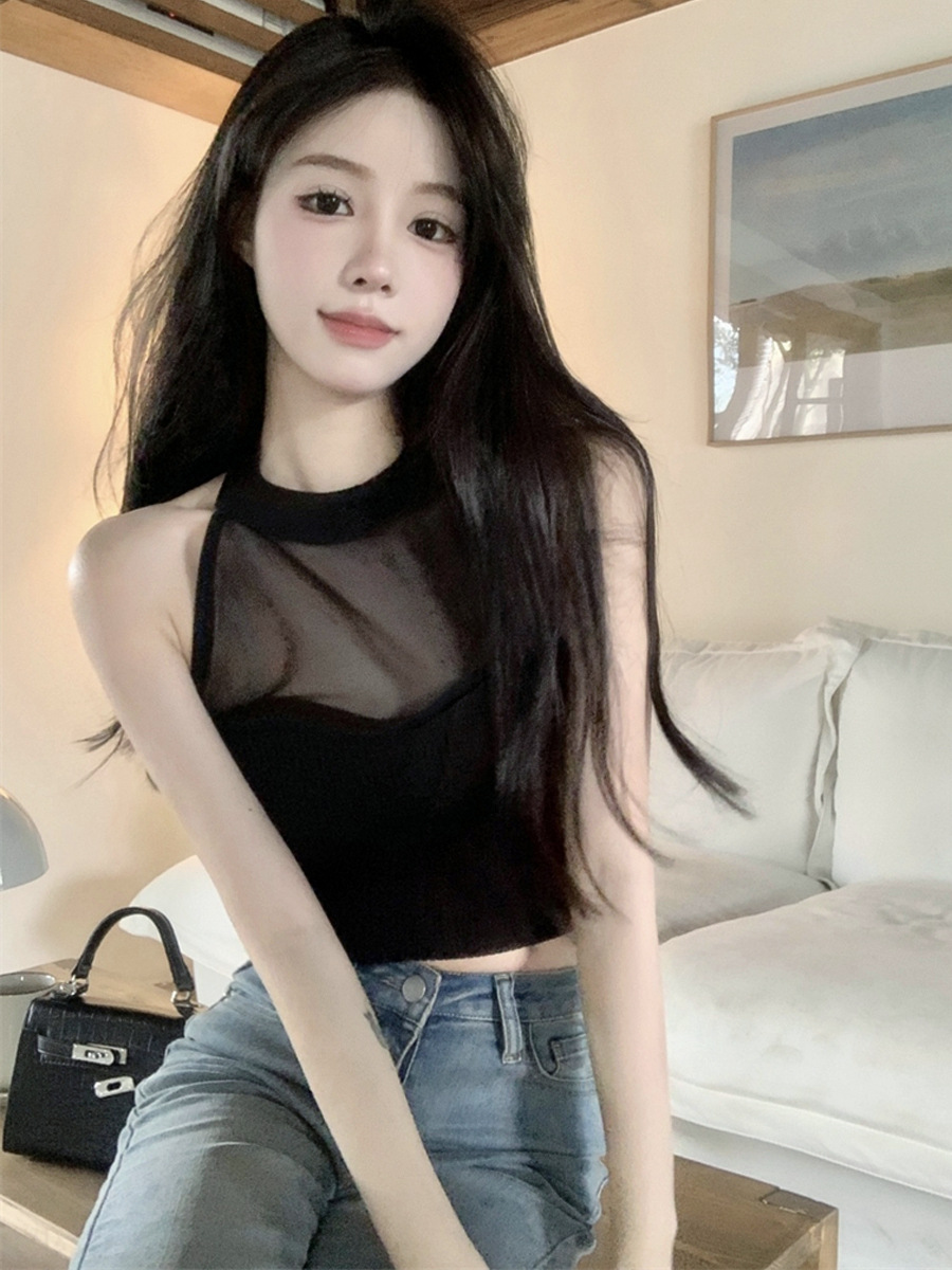 甜辣妹吊带背心外穿性感网纱透视挂脖无袖纯欲风美背短款上衣