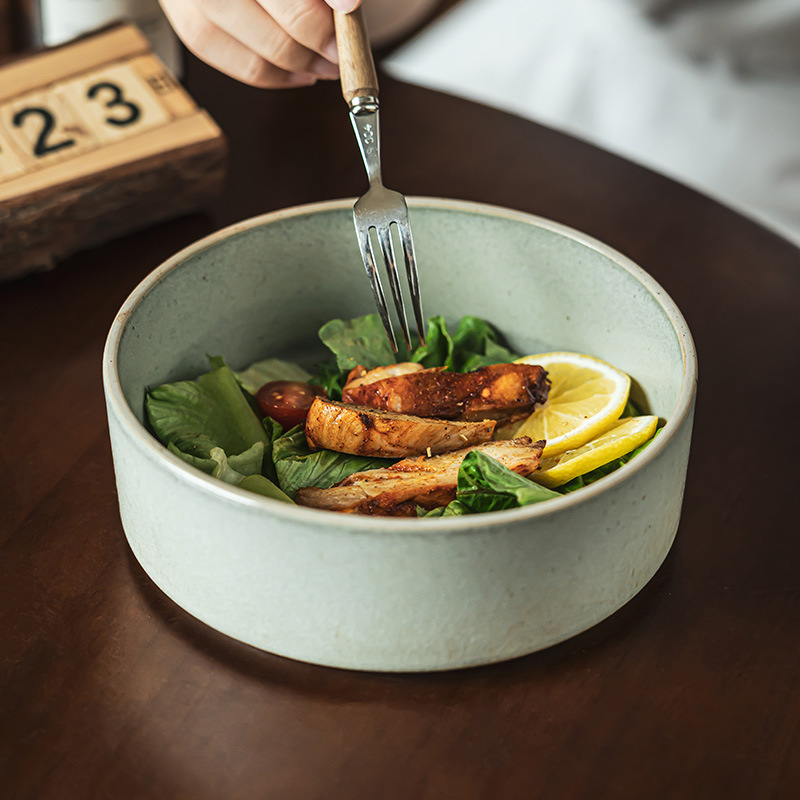 简约复古风淡绿陶瓷直身碗平底圆碗家用餐具菜碗汤盘水果碗沙拉碗