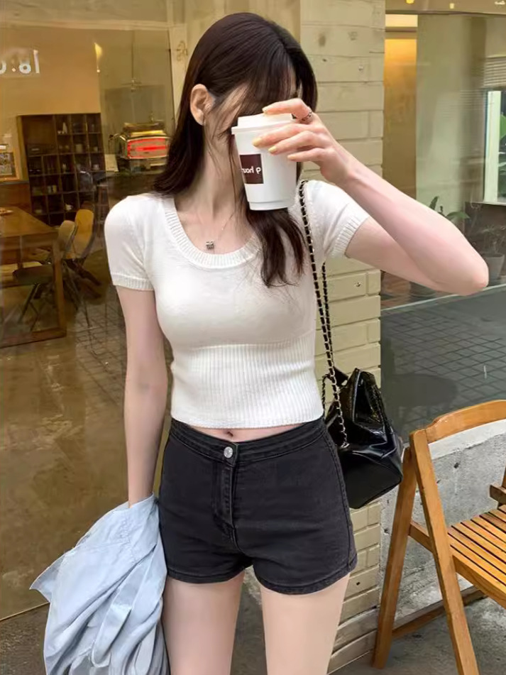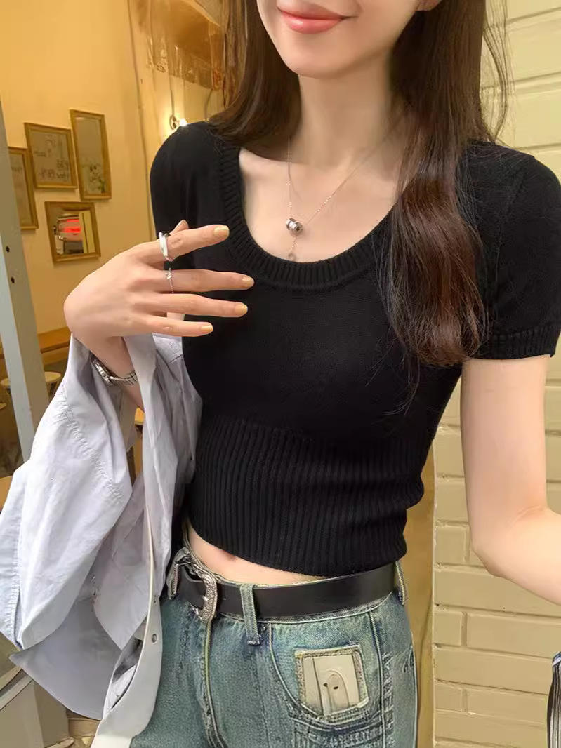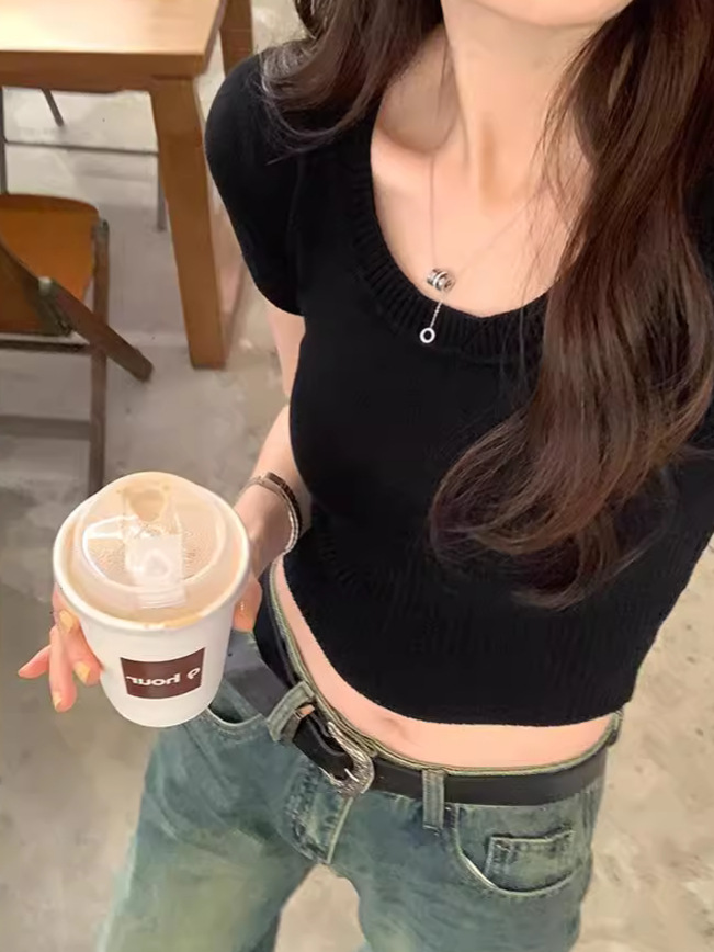 夏新款针织衫短袖T恤女法式U领漏锁骨甜辣紧身设计感短款上衣