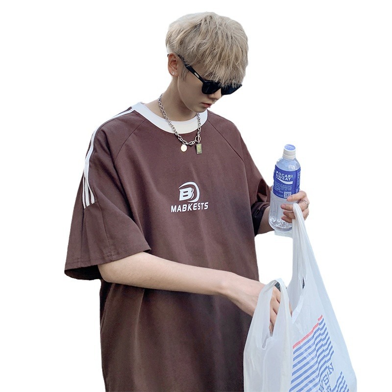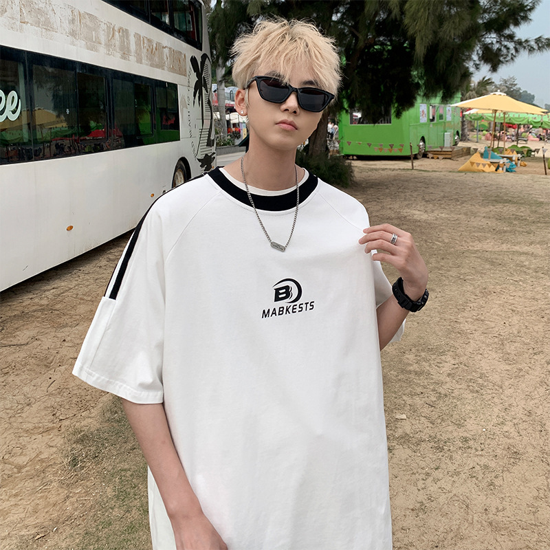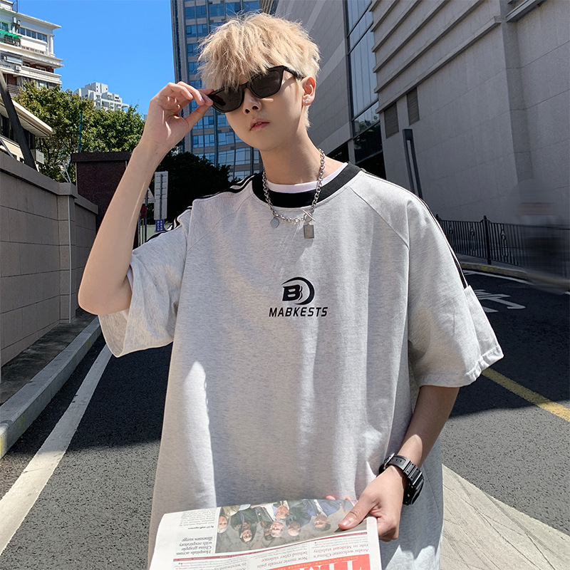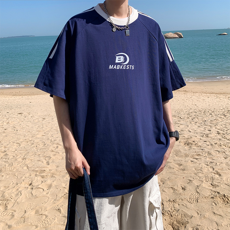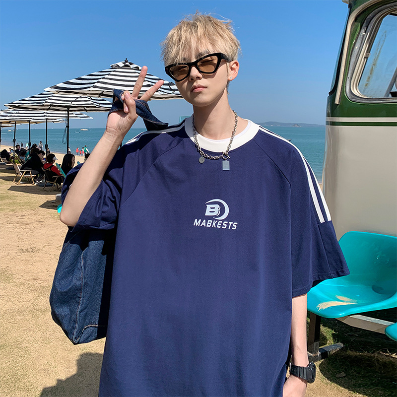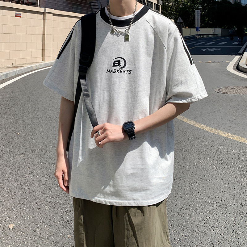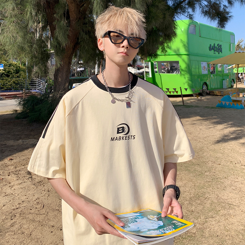 条纹港风复古短袖t恤男夏季新款宽松高街半袖潮流休闲打底衫