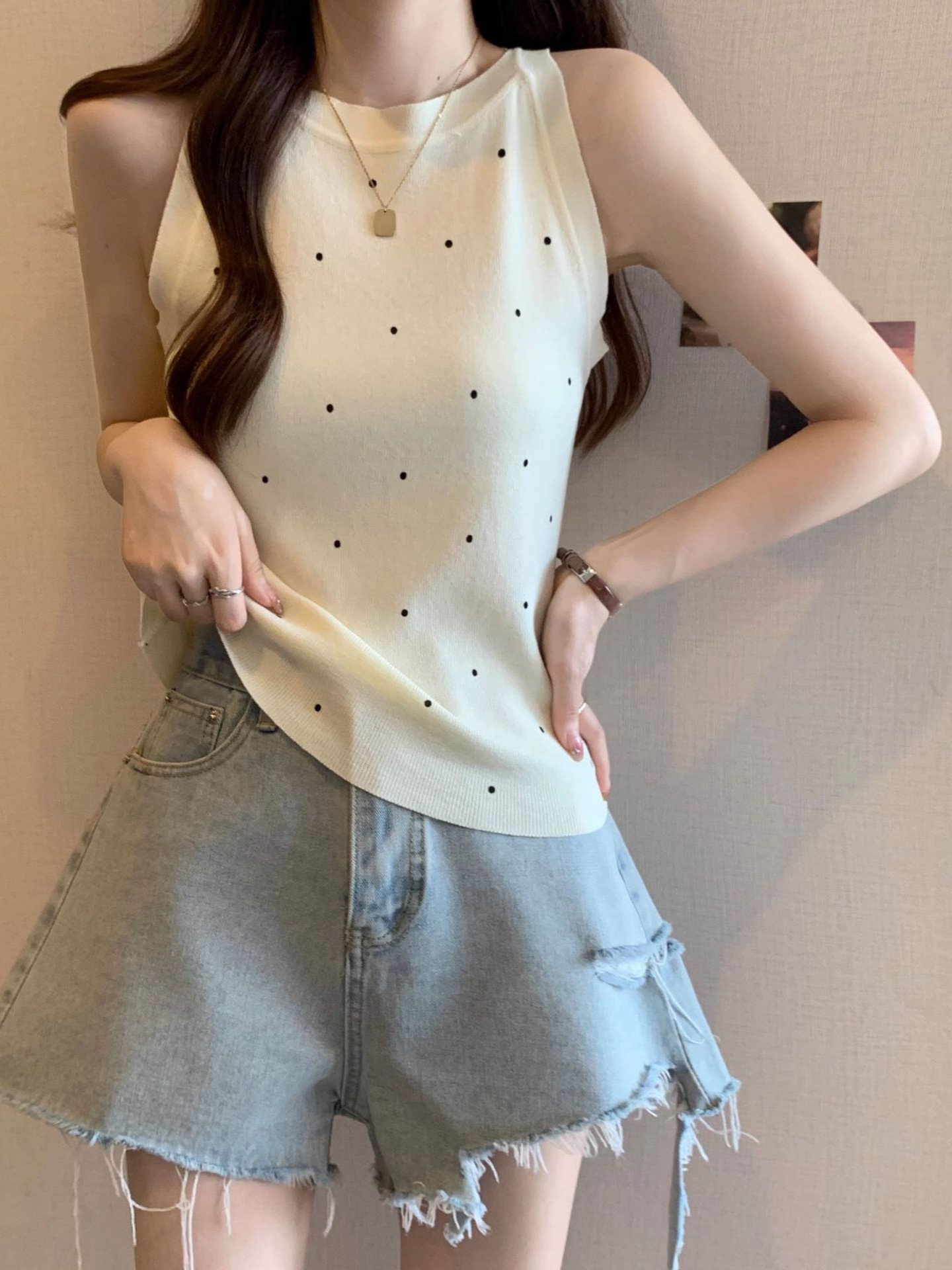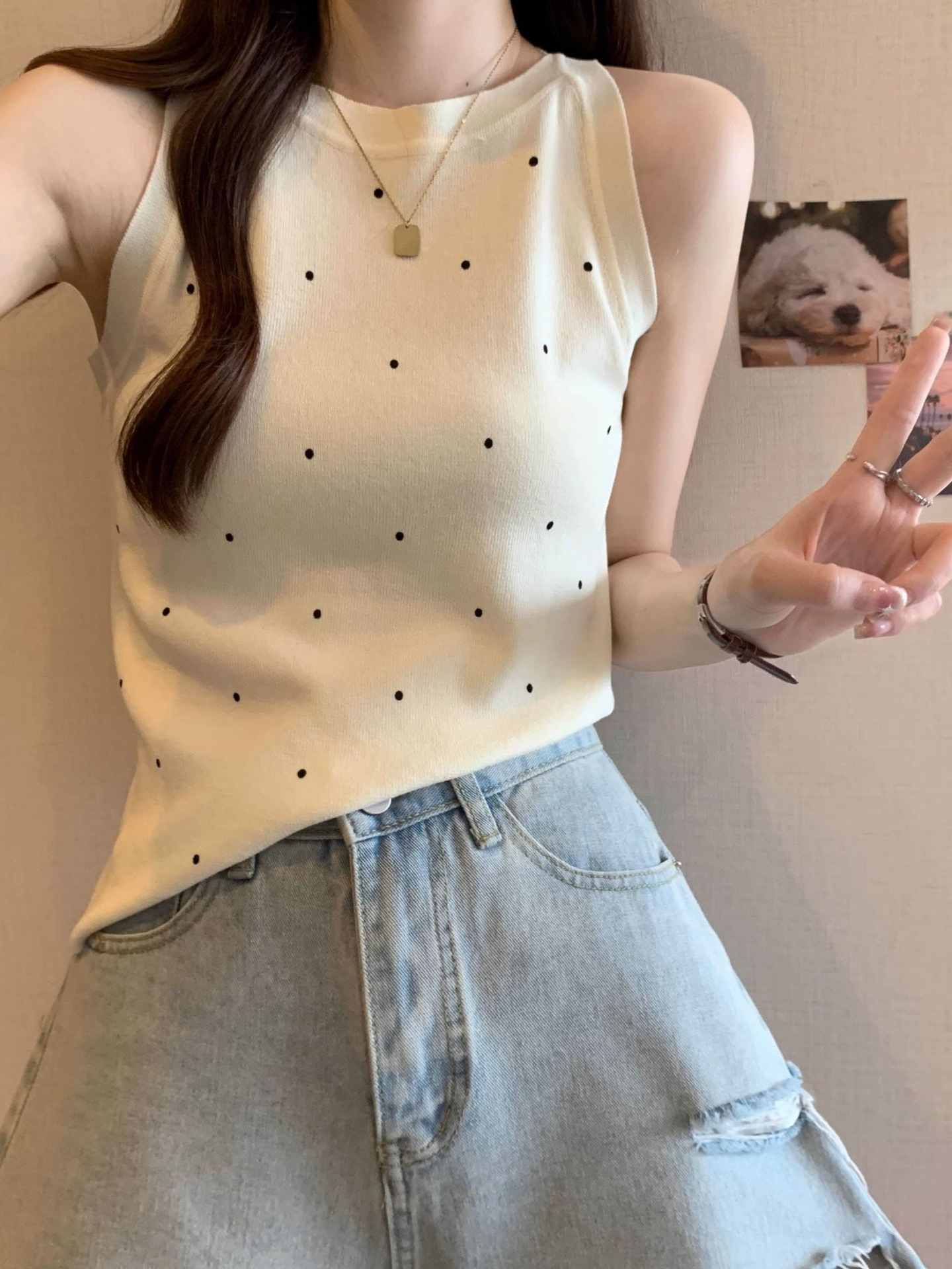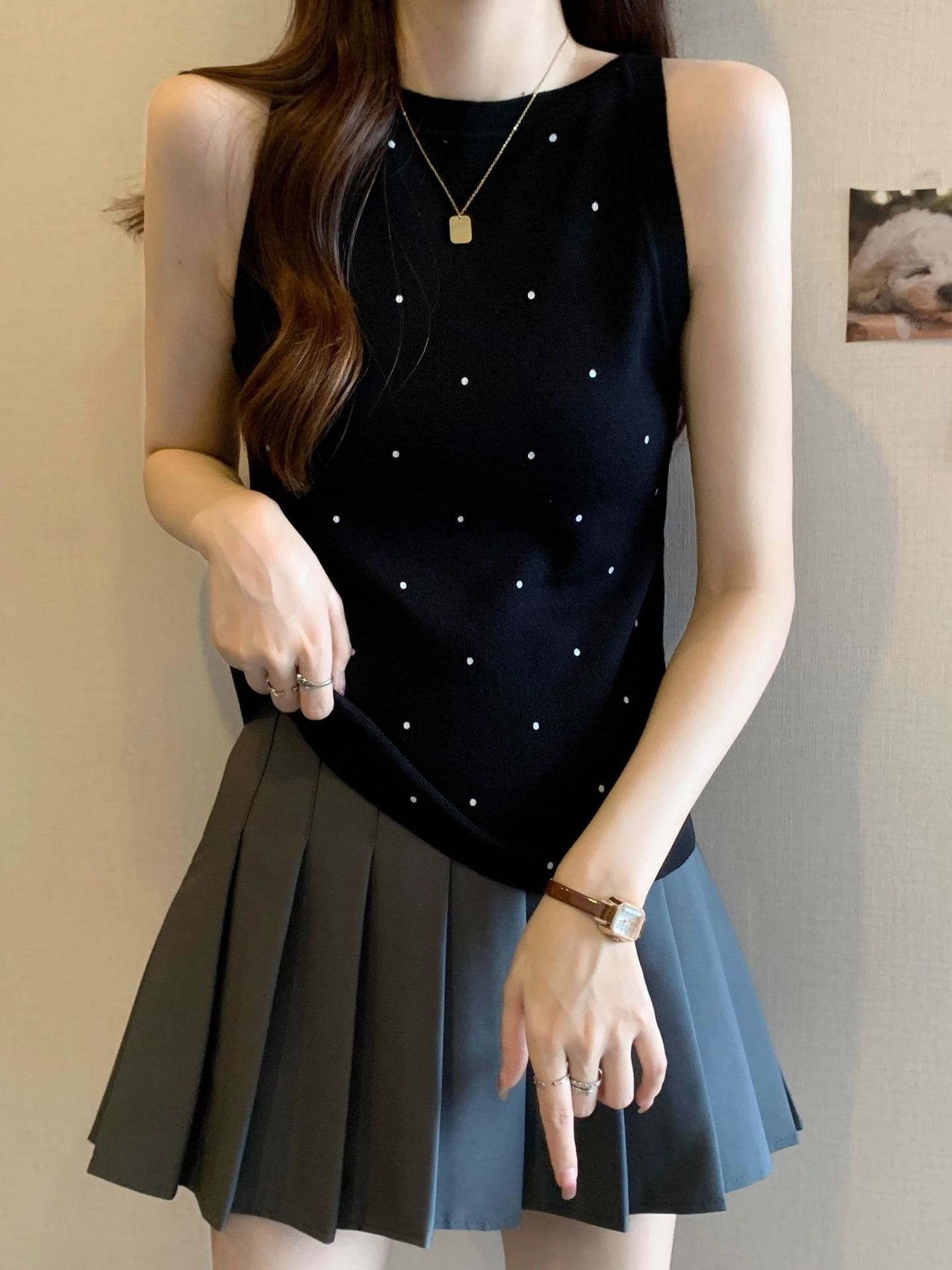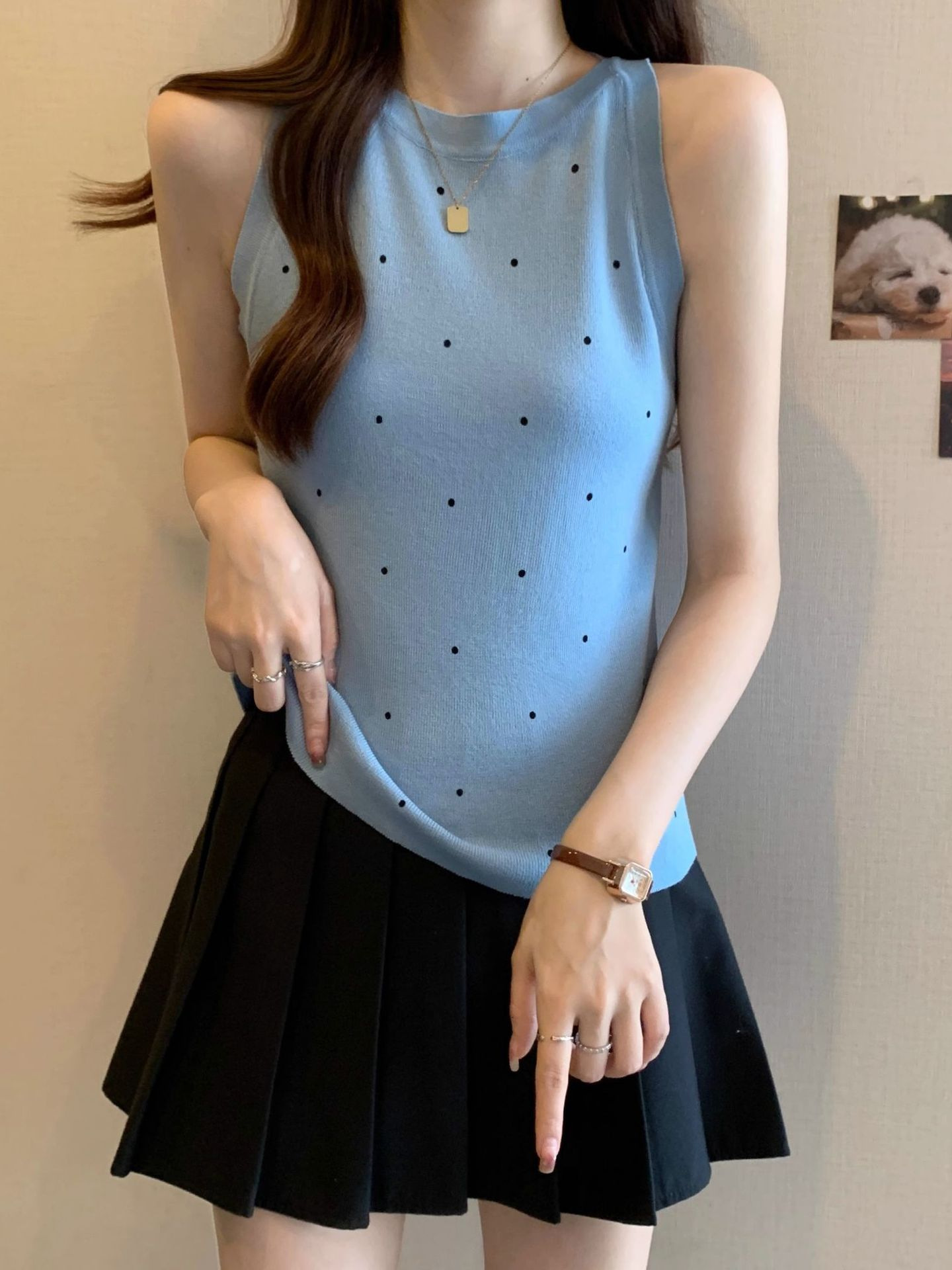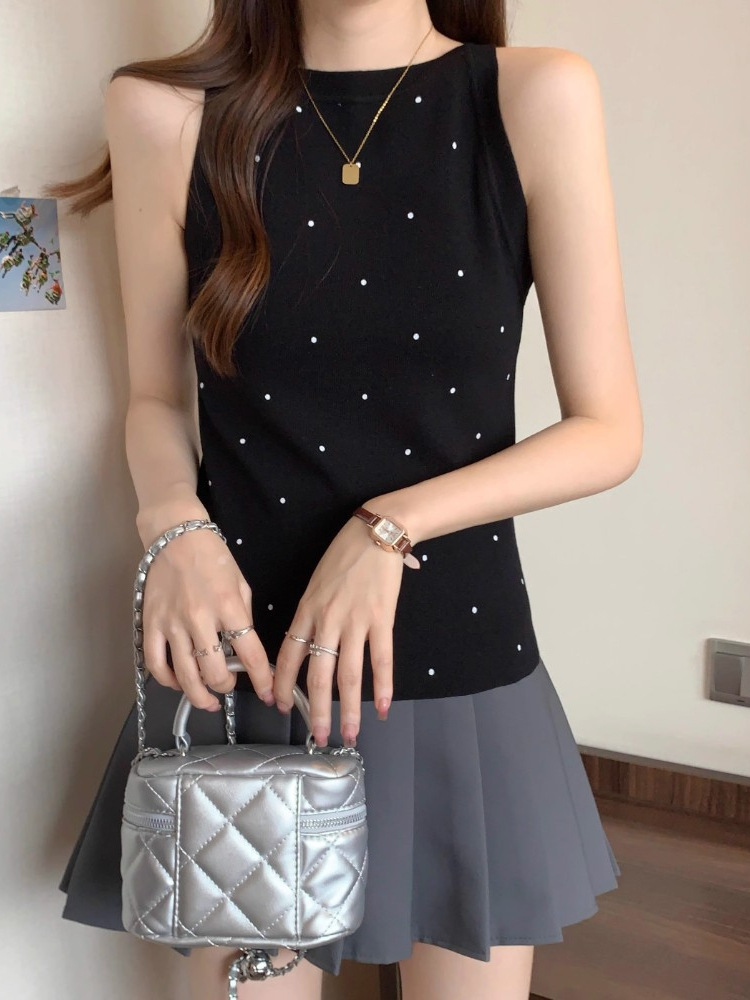 复古风休闲波点针织衫背心女夏季外穿无袖修身显瘦上衣