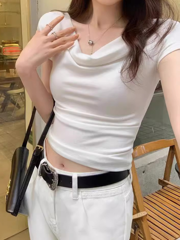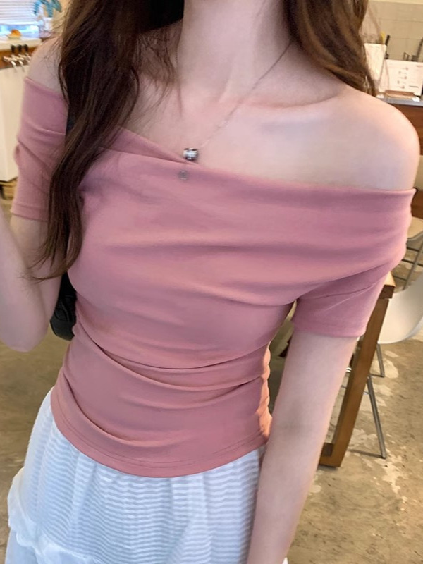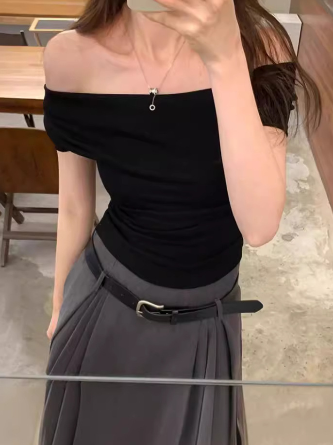 法式荡领一字肩短袖夏露锁骨设计感修身辣妹紧身露肩短款上衣