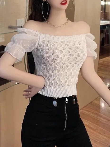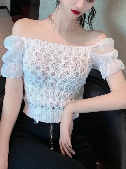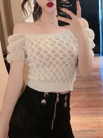 纯欲风针织衫性感网纱镂空一字领短袖雪纺T恤短款修身女上衣