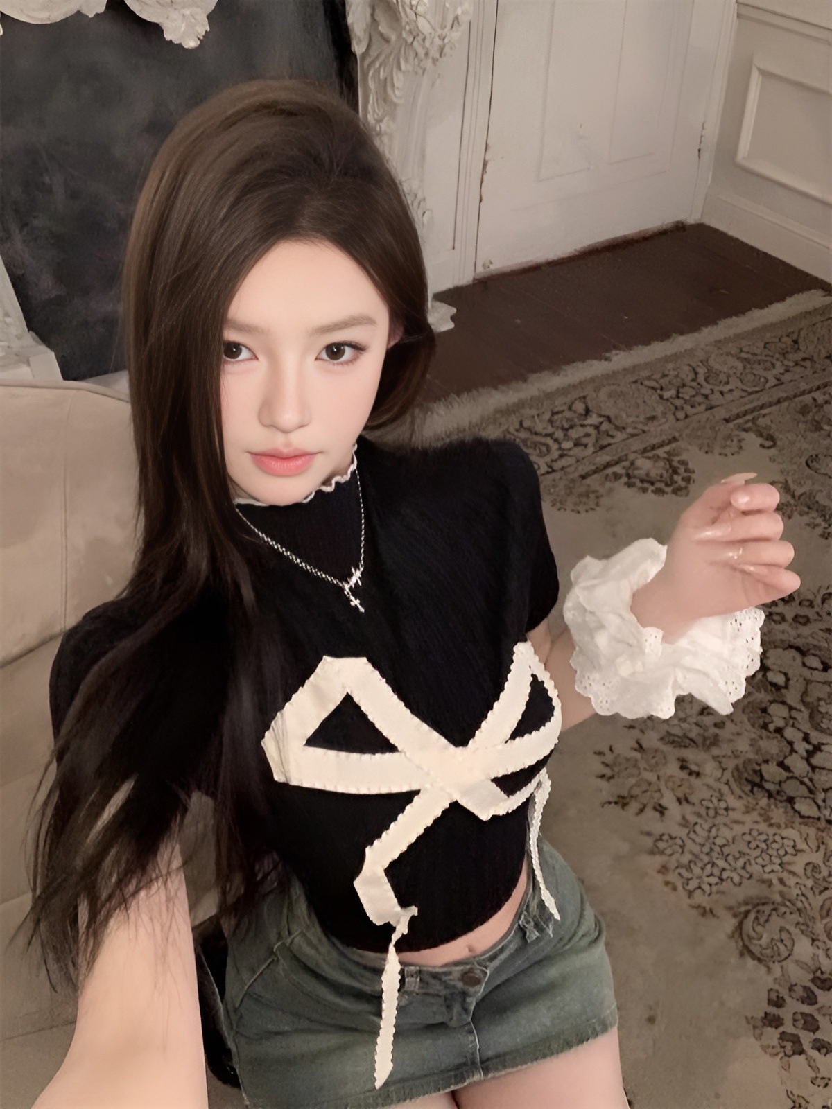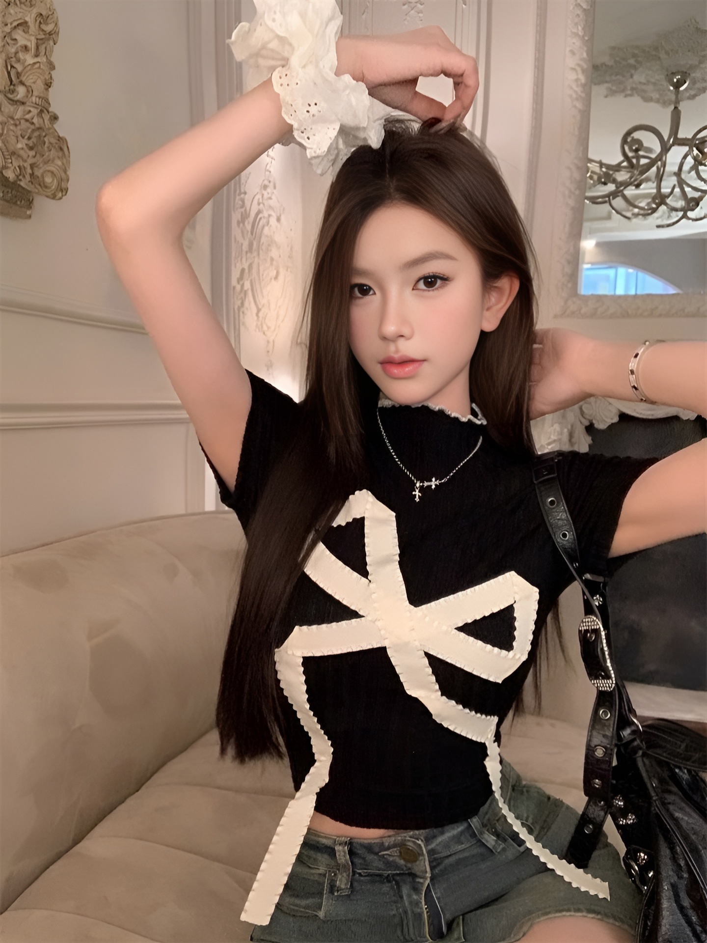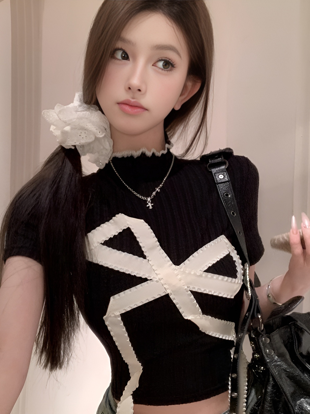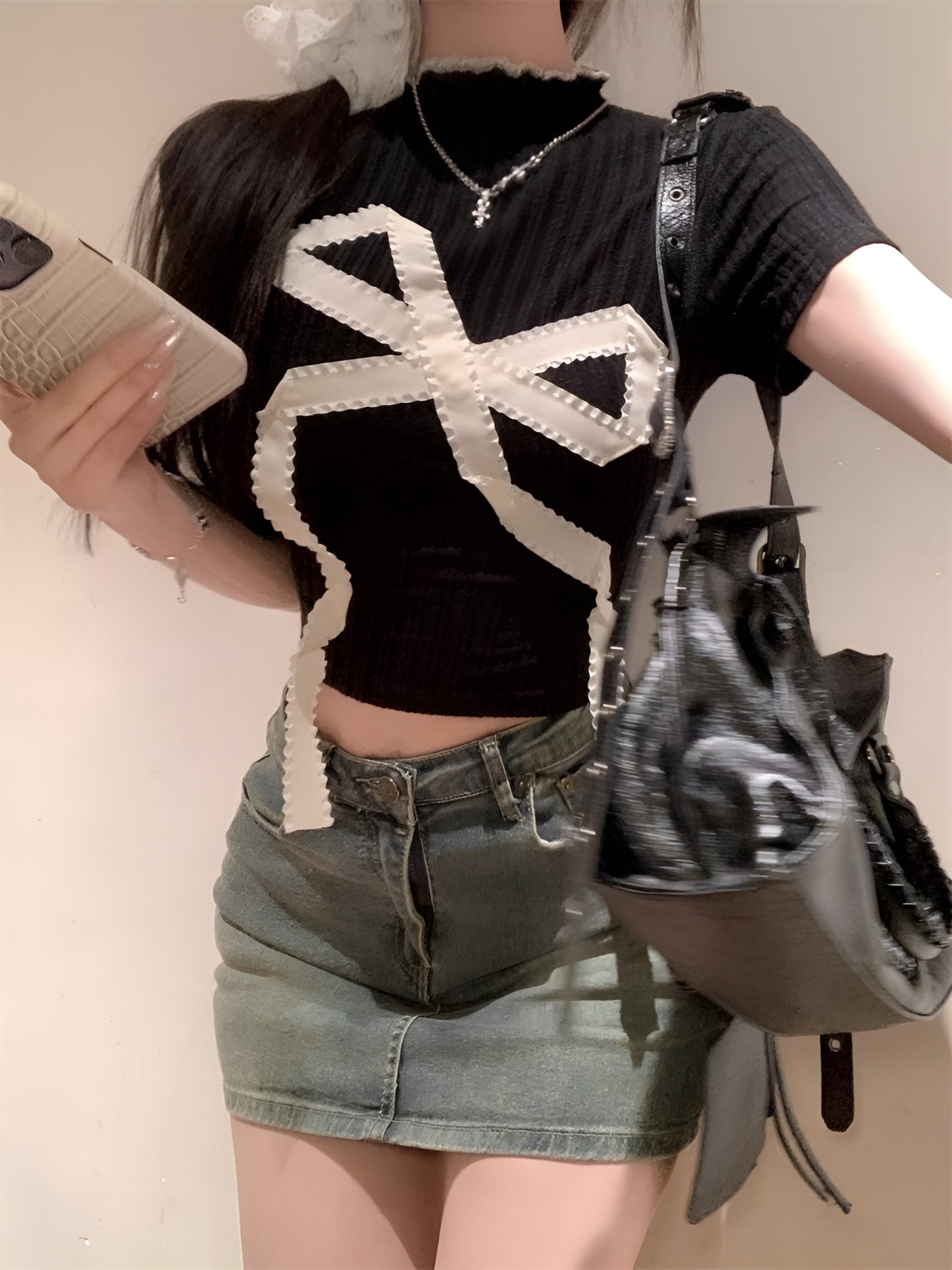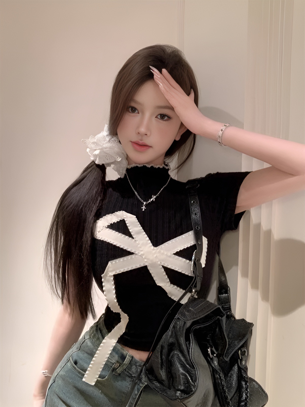 新款欧美风蝴蝶结修身显瘦时尚半高领正肩短袖T恤上衣女