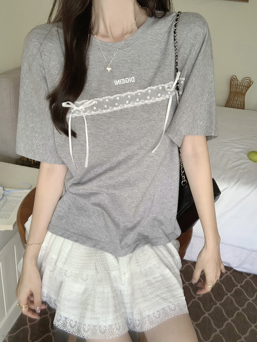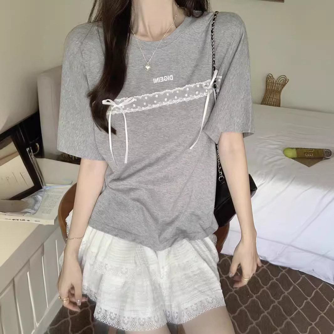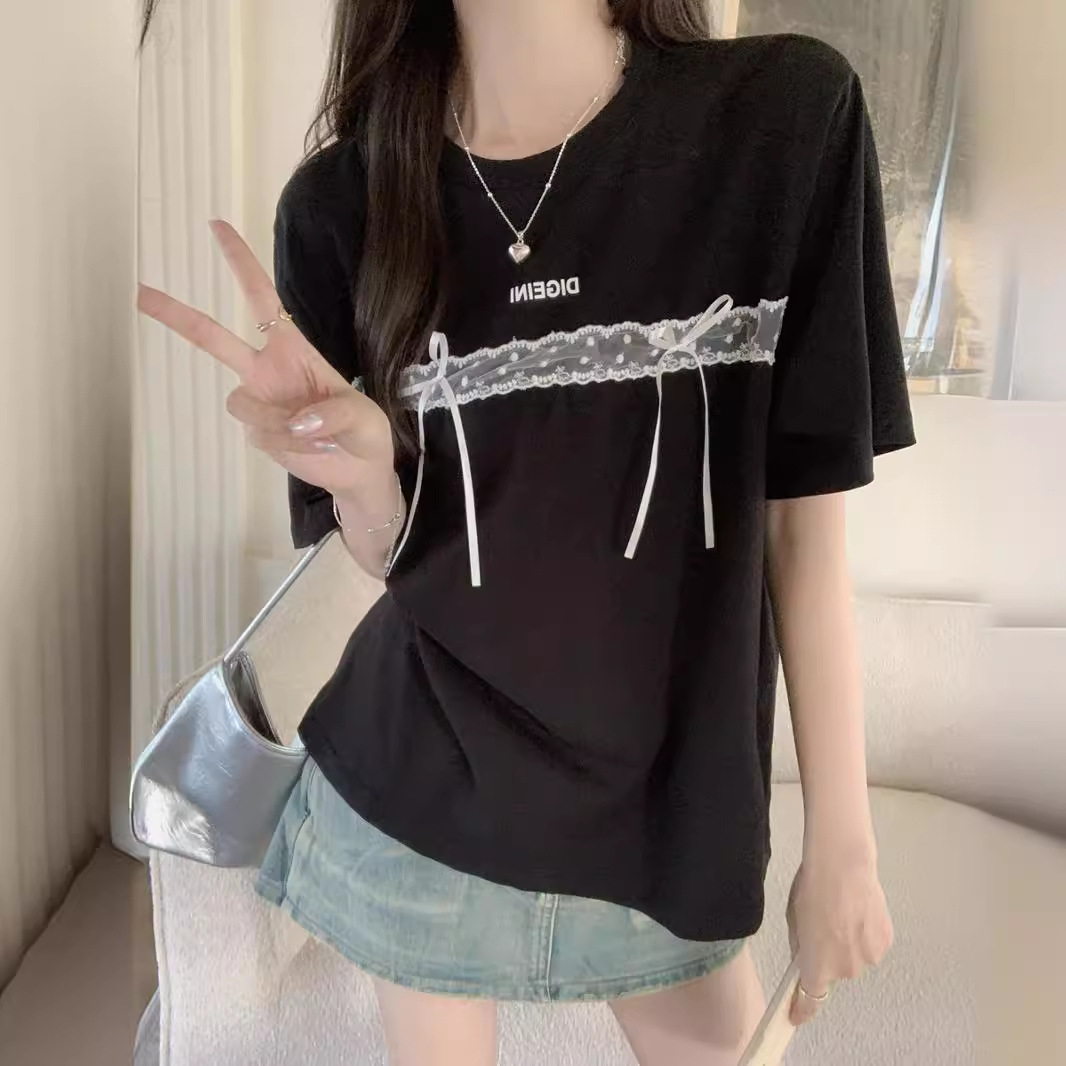 蕾丝花边蝴蝶结短袖T恤女夏装纯棉宽松显瘦甜辣上衣服