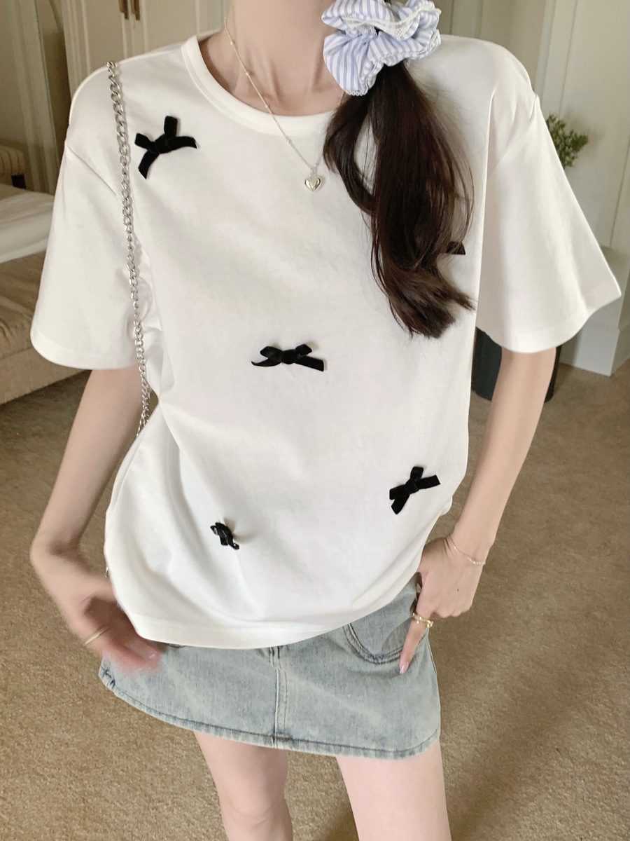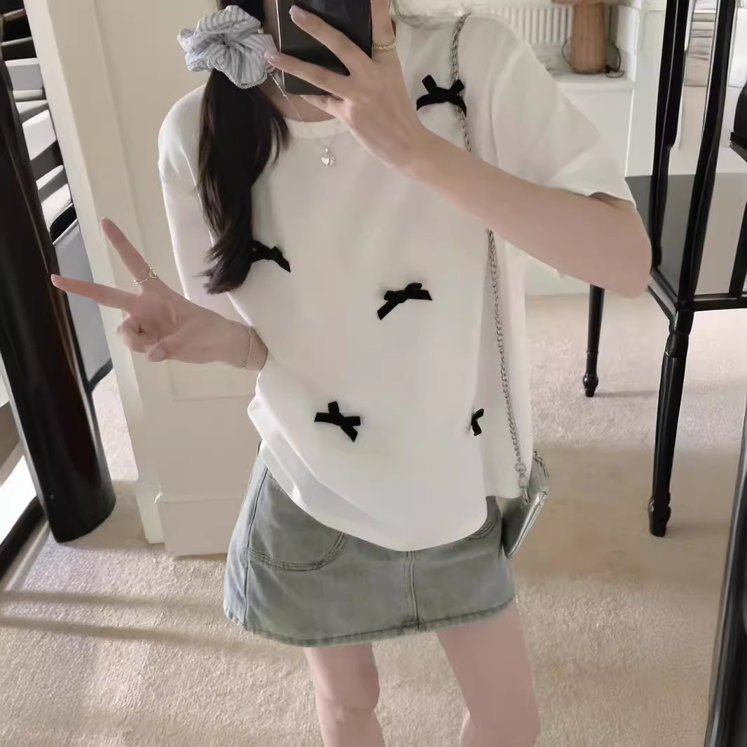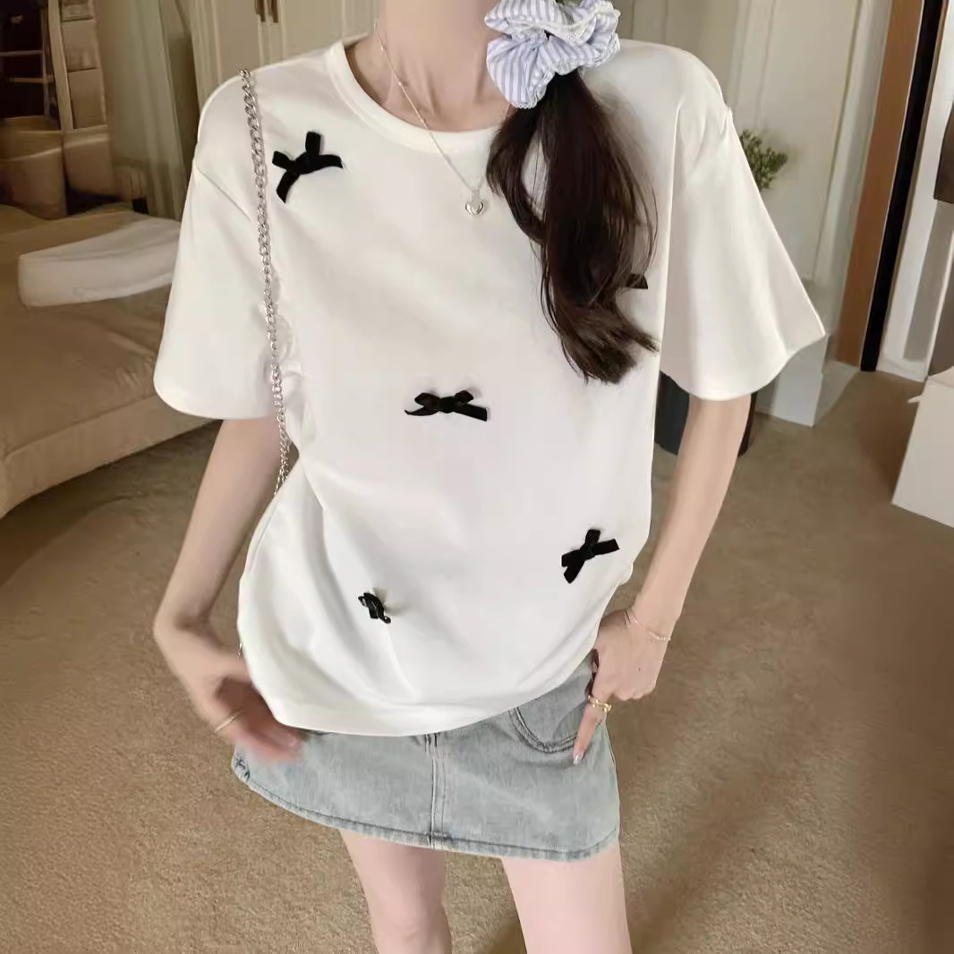 蝴蝶结短袖正肩T恤夏季大码宽松纯棉百搭甜辣上衣女法式体恤