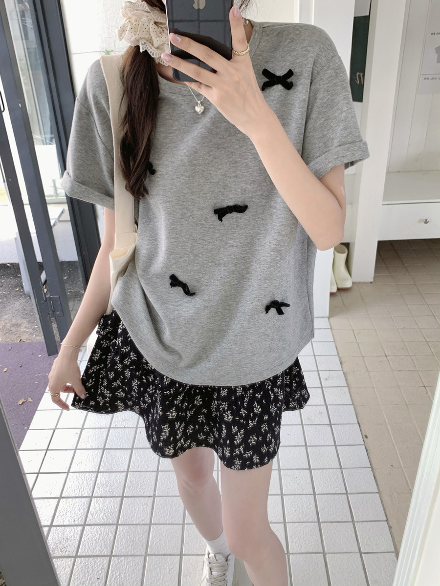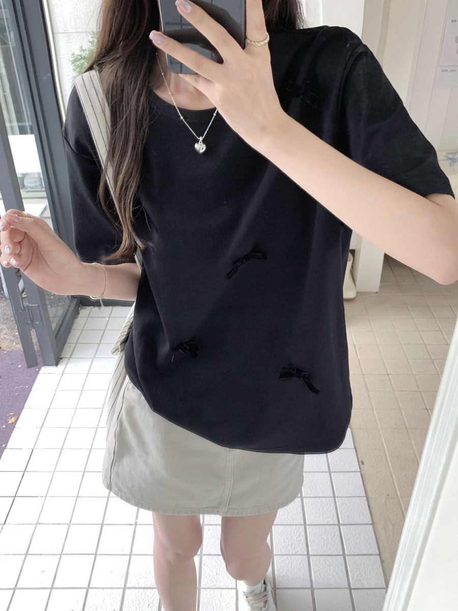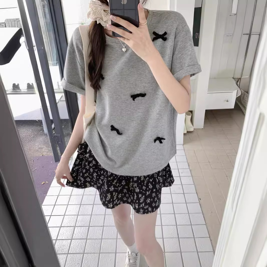 蝴蝶结短袖正肩T恤夏季大码宽松纯棉百搭甜辣上衣女法式体恤