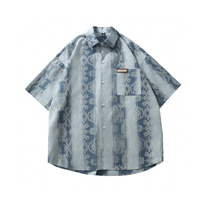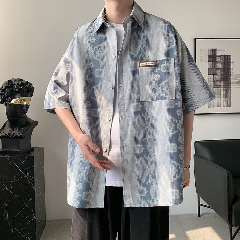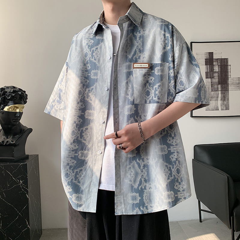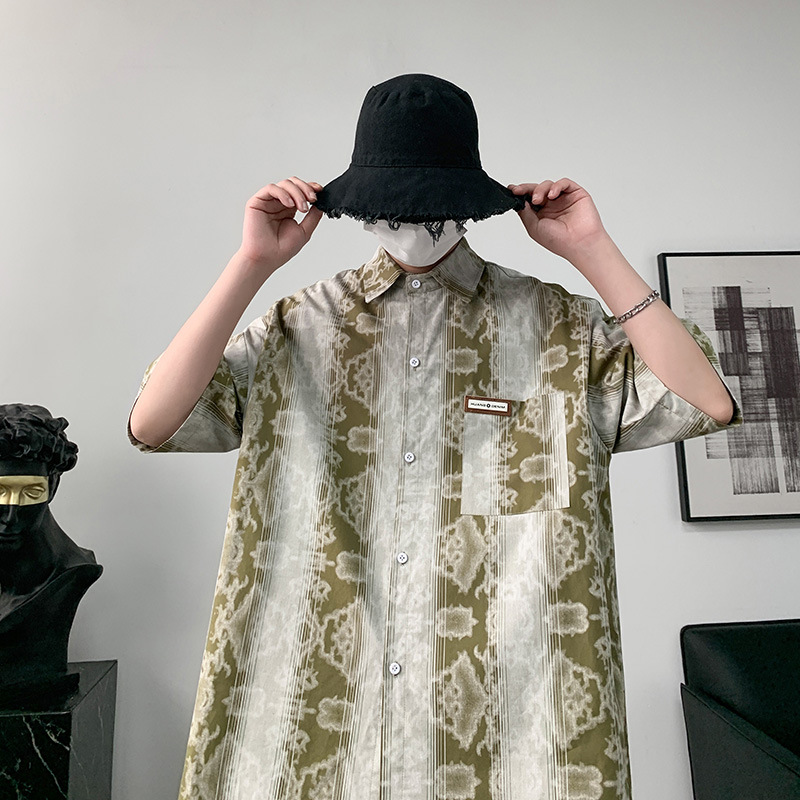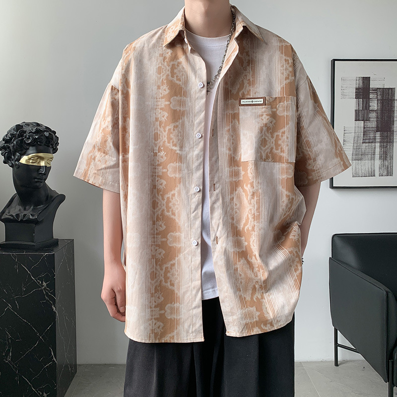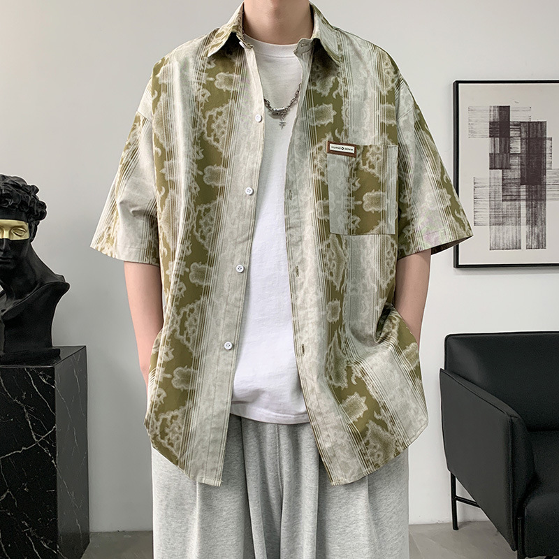 条纹休闲半袖衬衣港风日系小清新男士宽松短袖衬衫复古花衬衫夏季