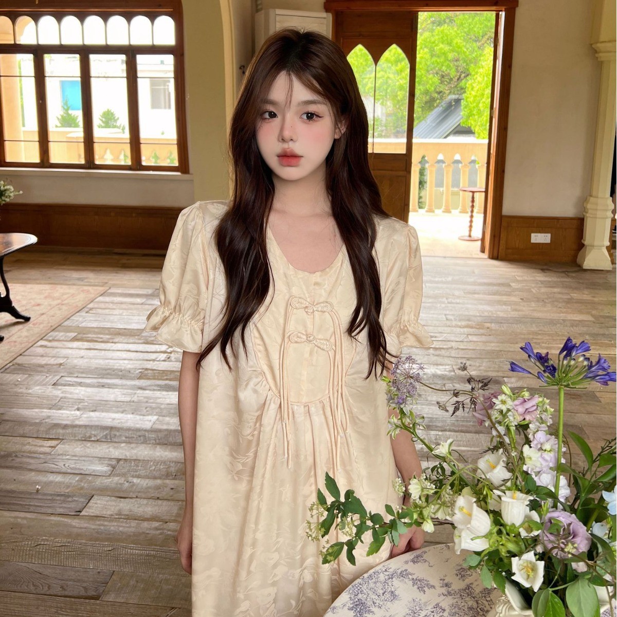 半熟芝士冰丝国风睡裙夏季新中式高级感甜美慵懒睡裙复古可外穿