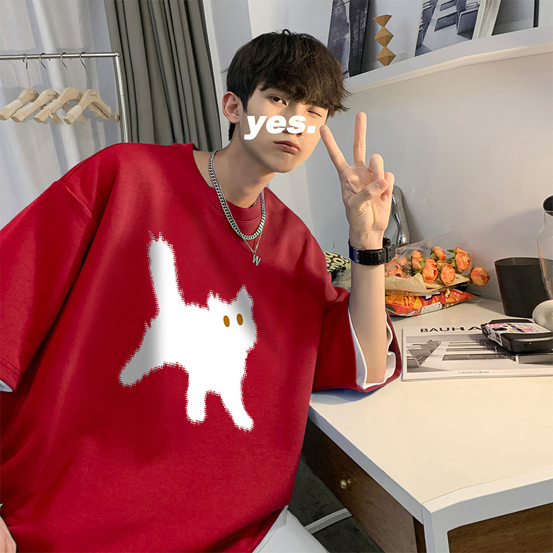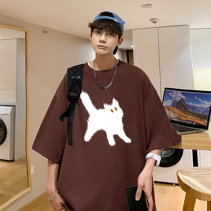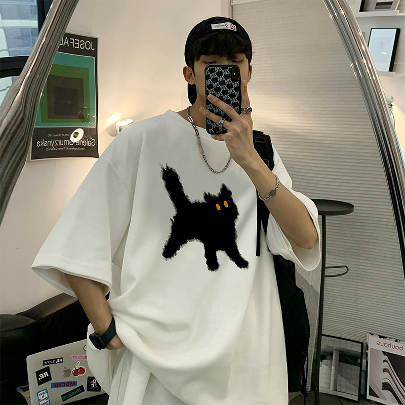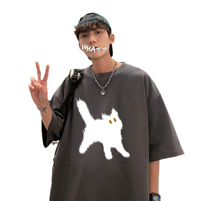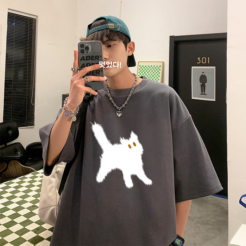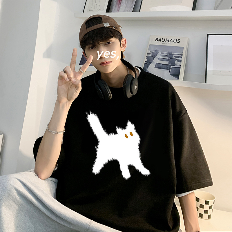 猫咪印花重磅T恤男款潮牌夏季美式复古衣服短袖设计感棉五分袖潮