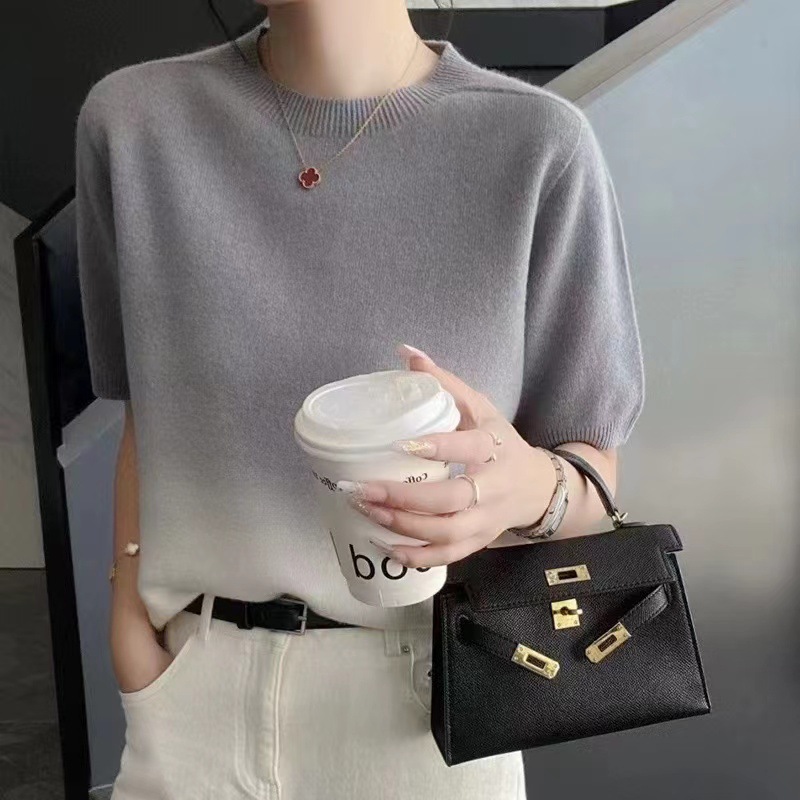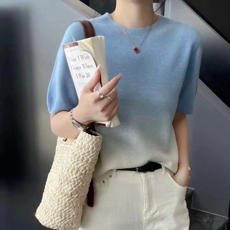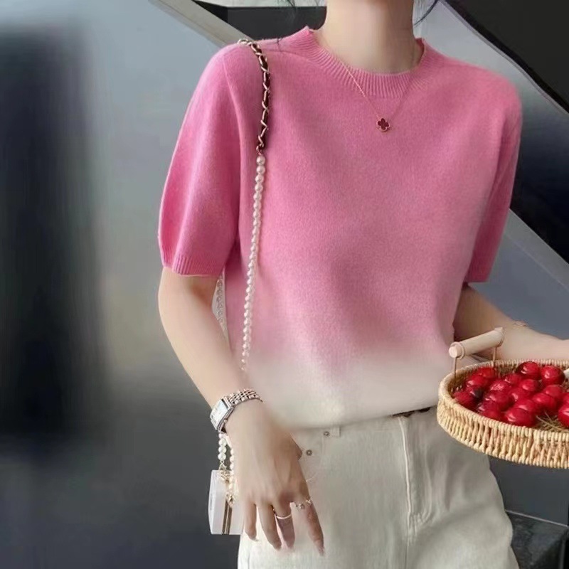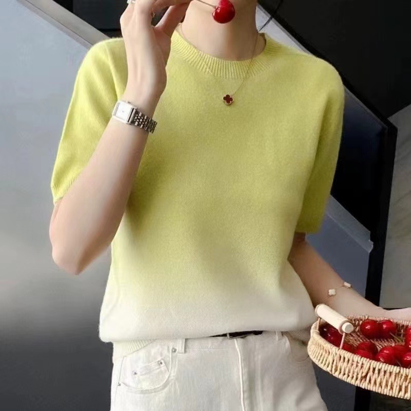 渐变色T恤细羊毛五分袖螺纹边针织衫薄款气质宽松圆领上衣女春夏