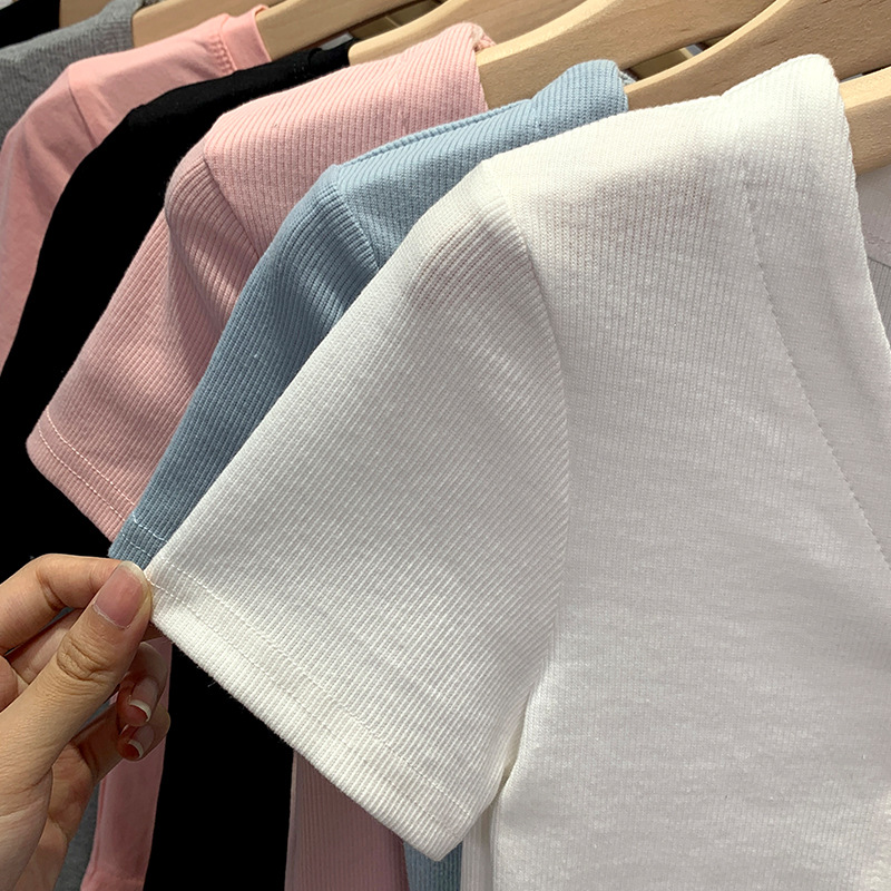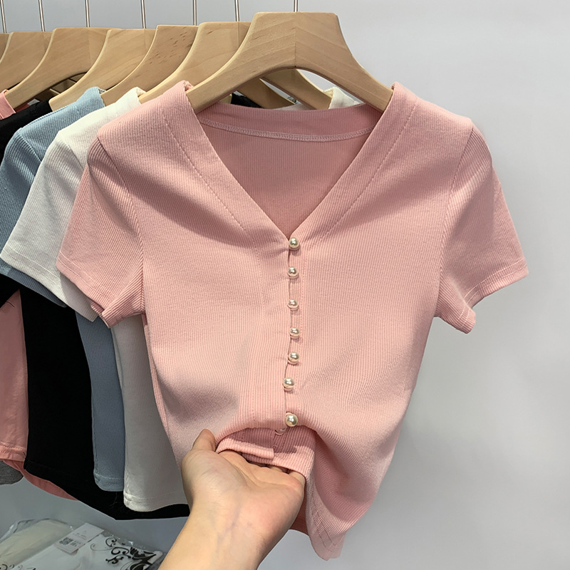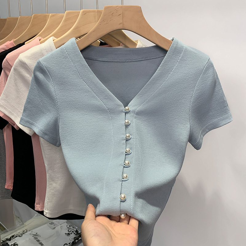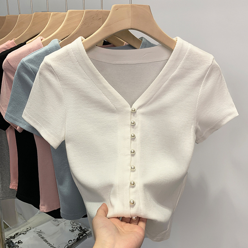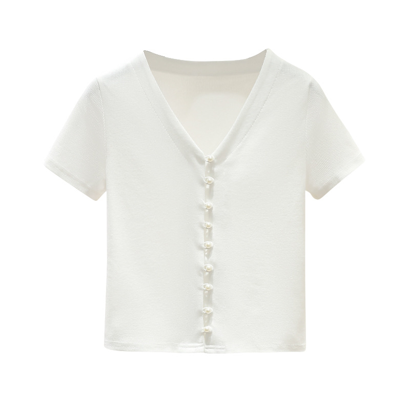 V领珍珠扣短袖T恤女夏季新款时尚洋气设计感小众上衣修身显瘦