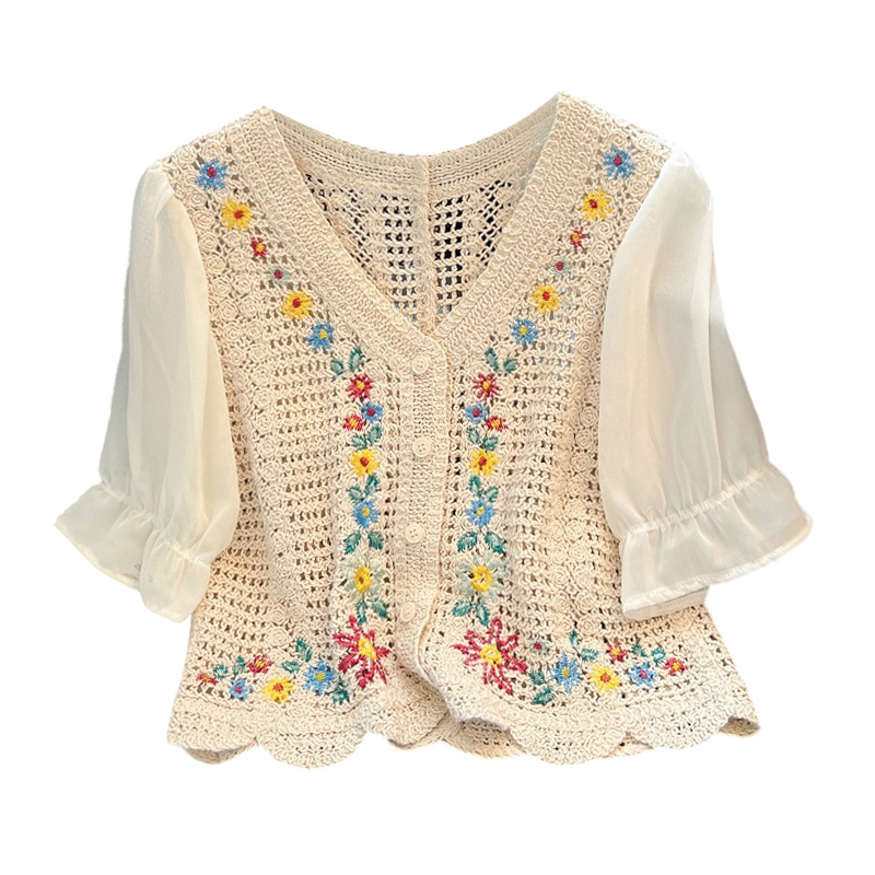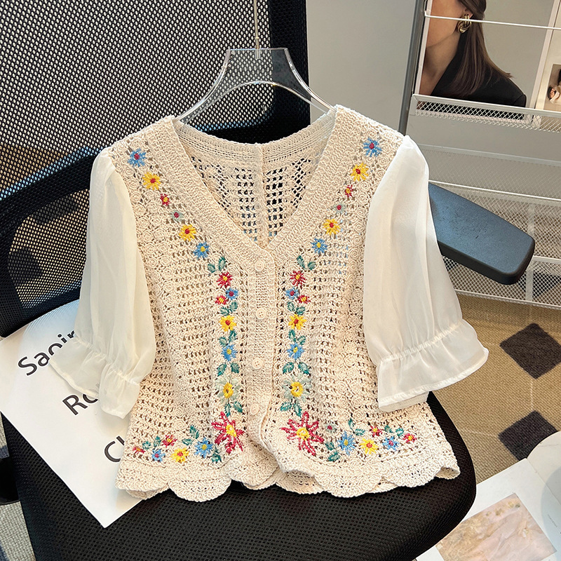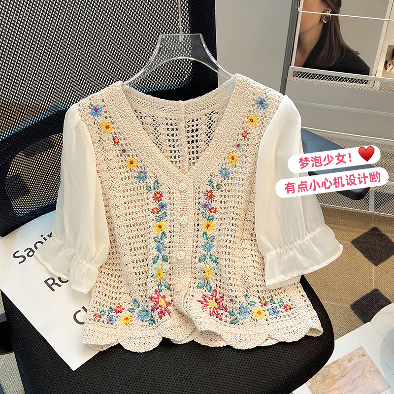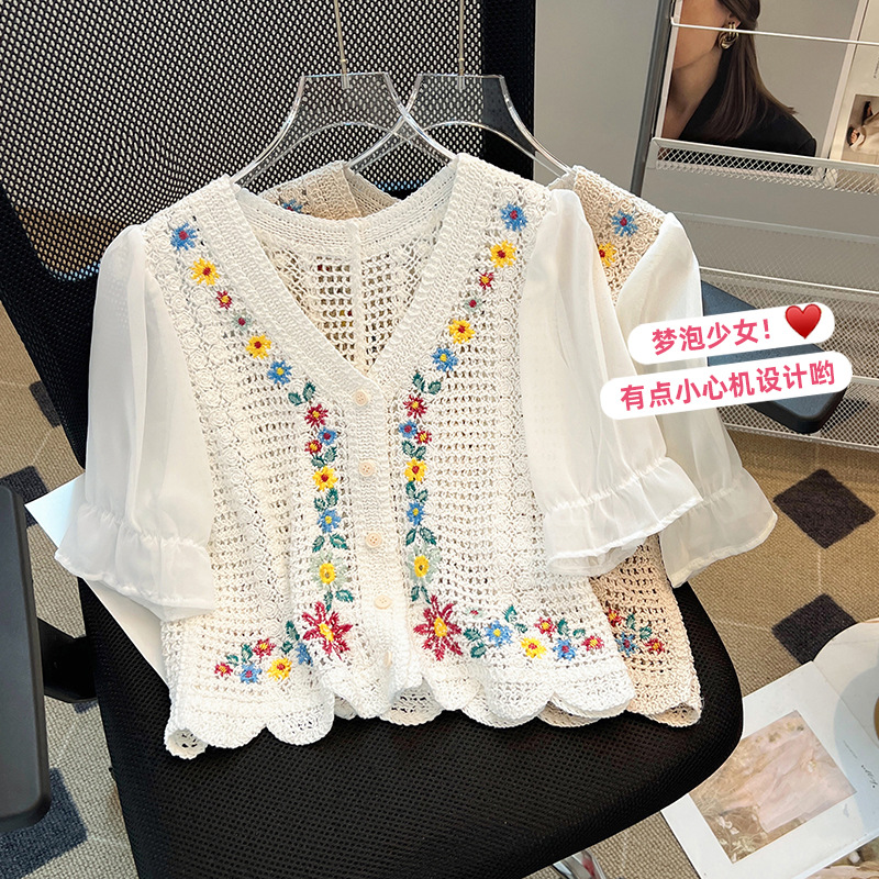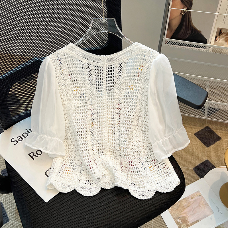 小清新短袖钩花针织短款上衣女拼接设计感小众夏薄款高腰雪纺t恤