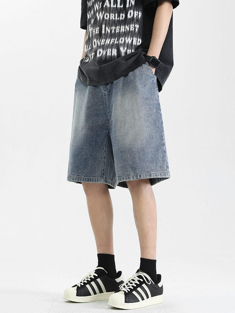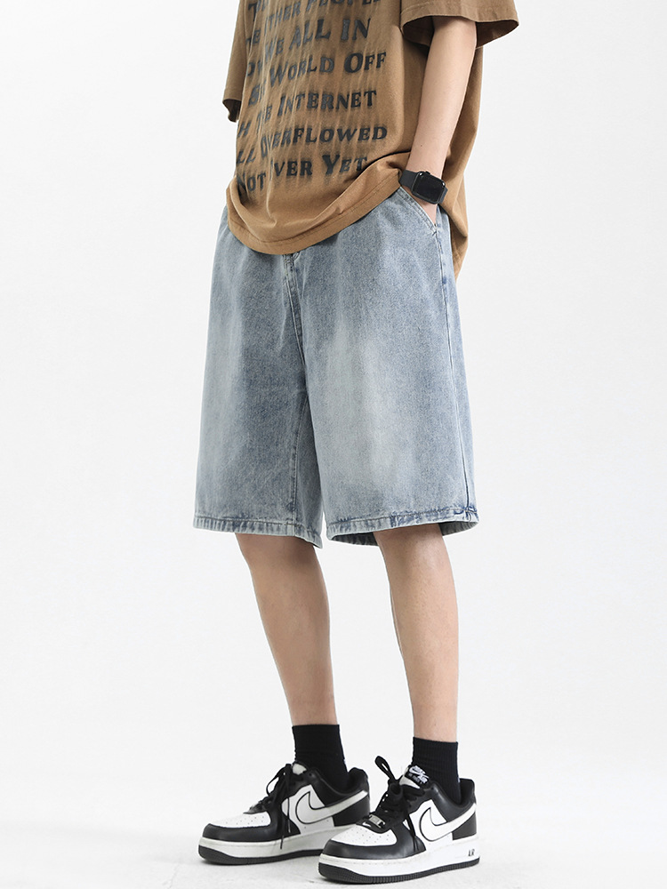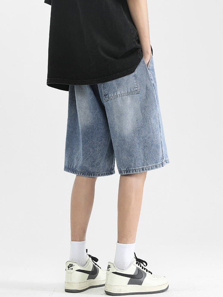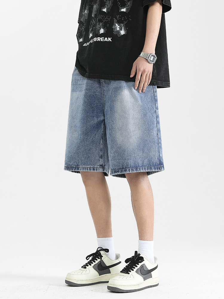 潮牌牛仔短裤男士夏季宽松直筒中裤美式高街复古水洗五分裤子