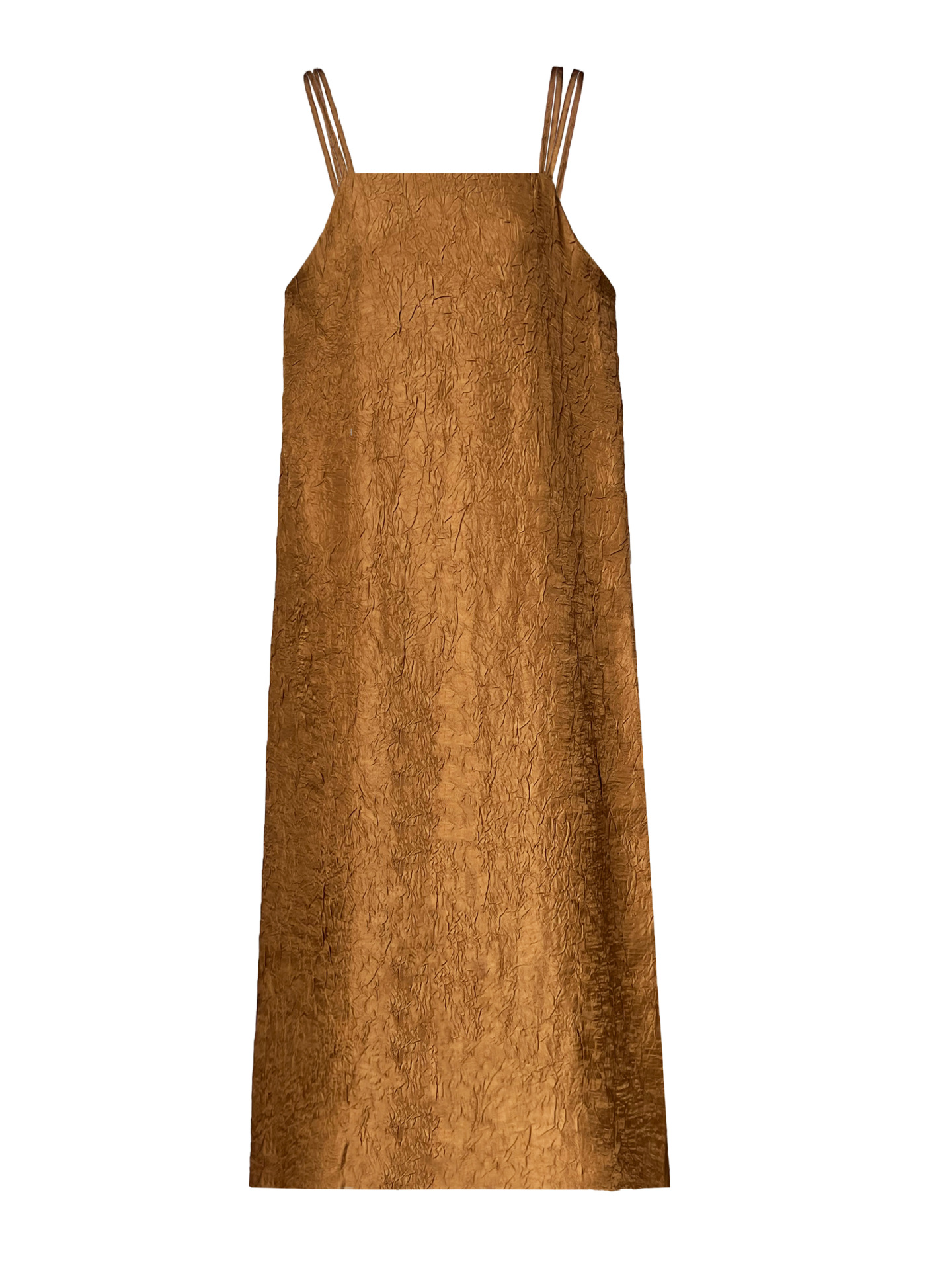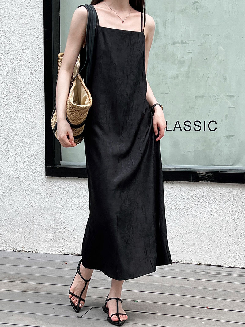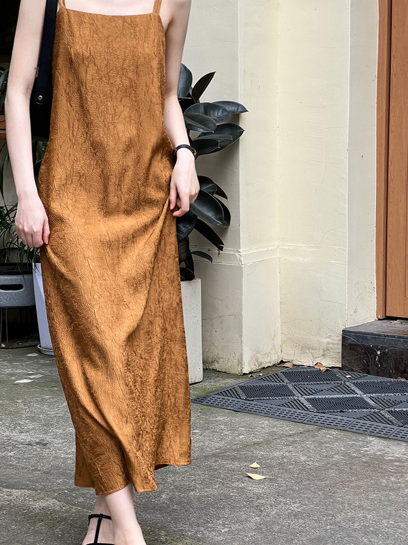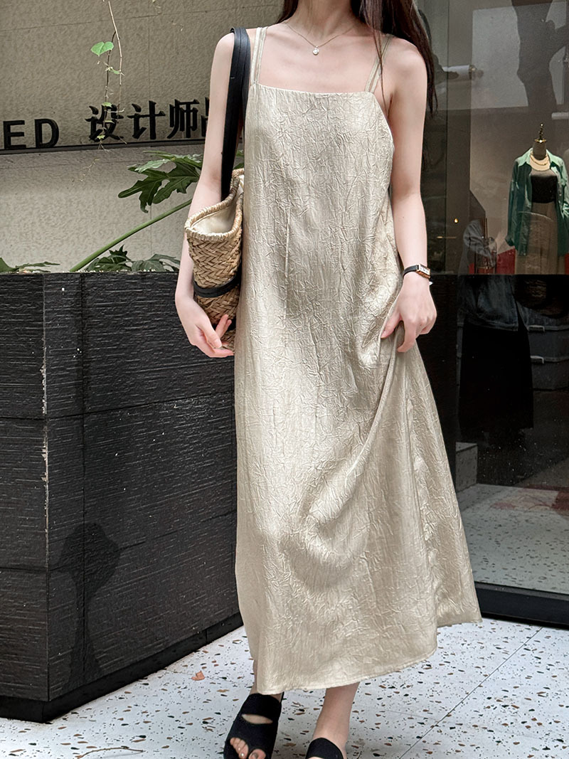 新中式双肩带褶皱肌理感吊带裙女内搭度假风无袖连衣裙