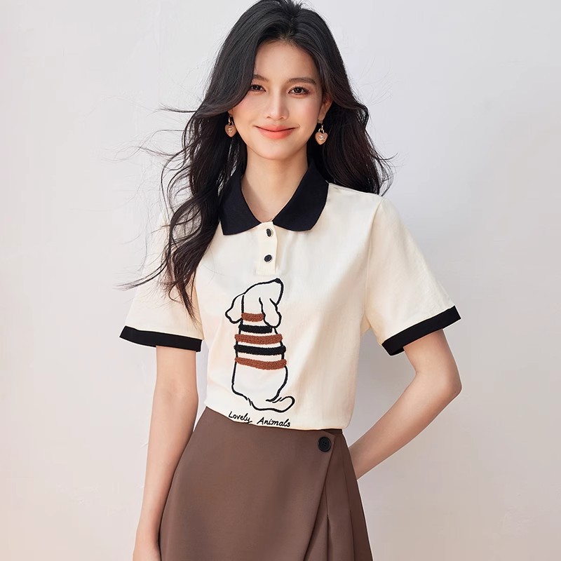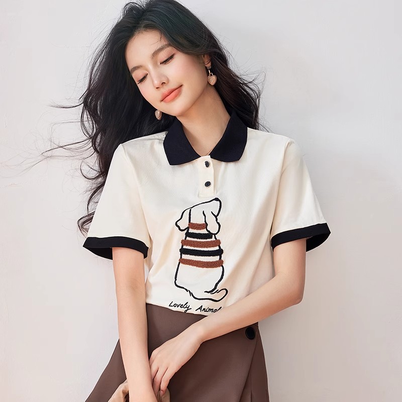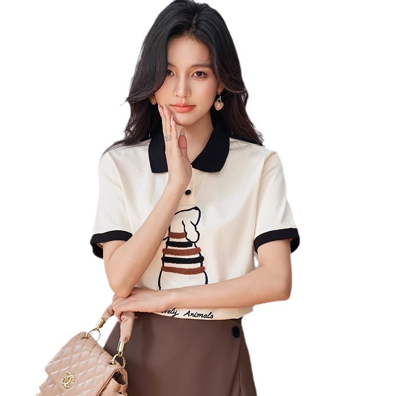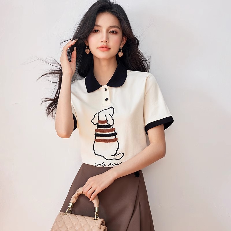 气质撞色polo领小狗T恤女夏季新款时尚短袖休闲圆领打底上衣