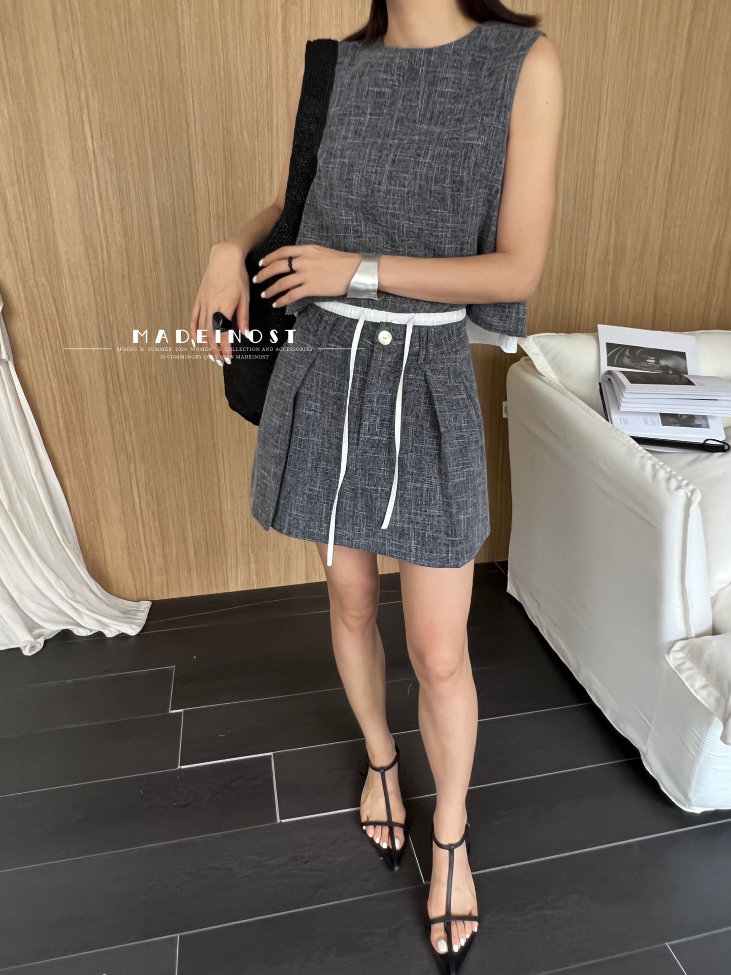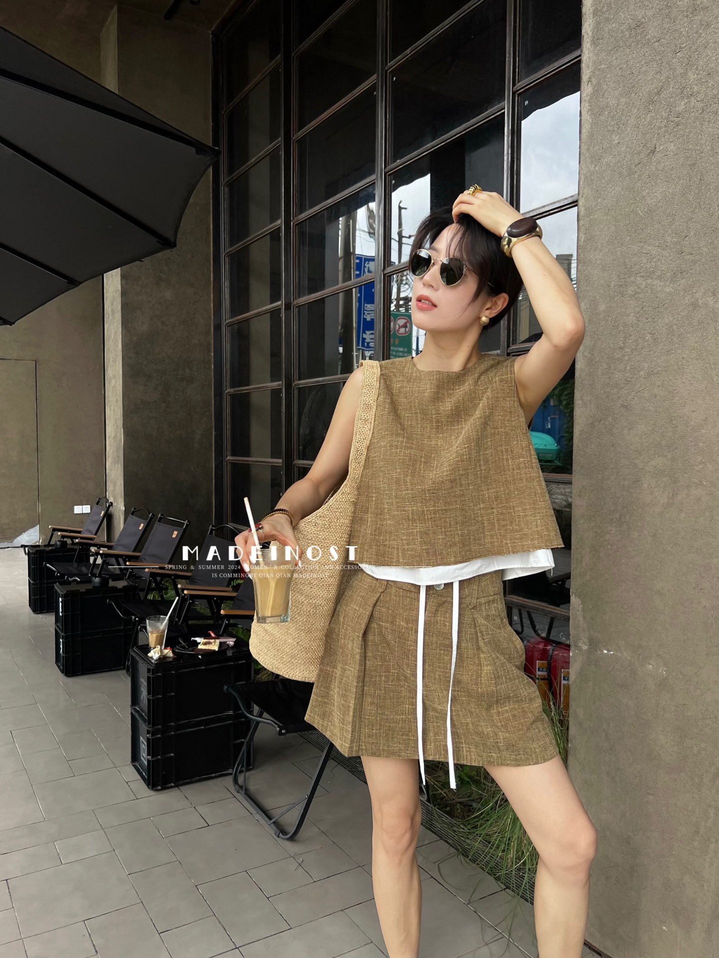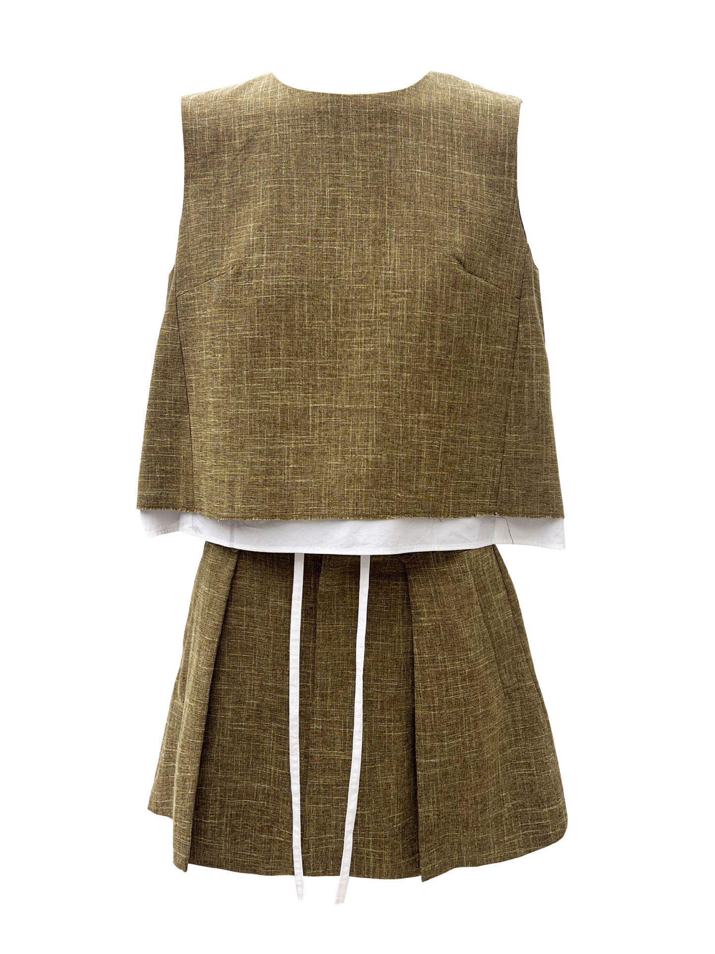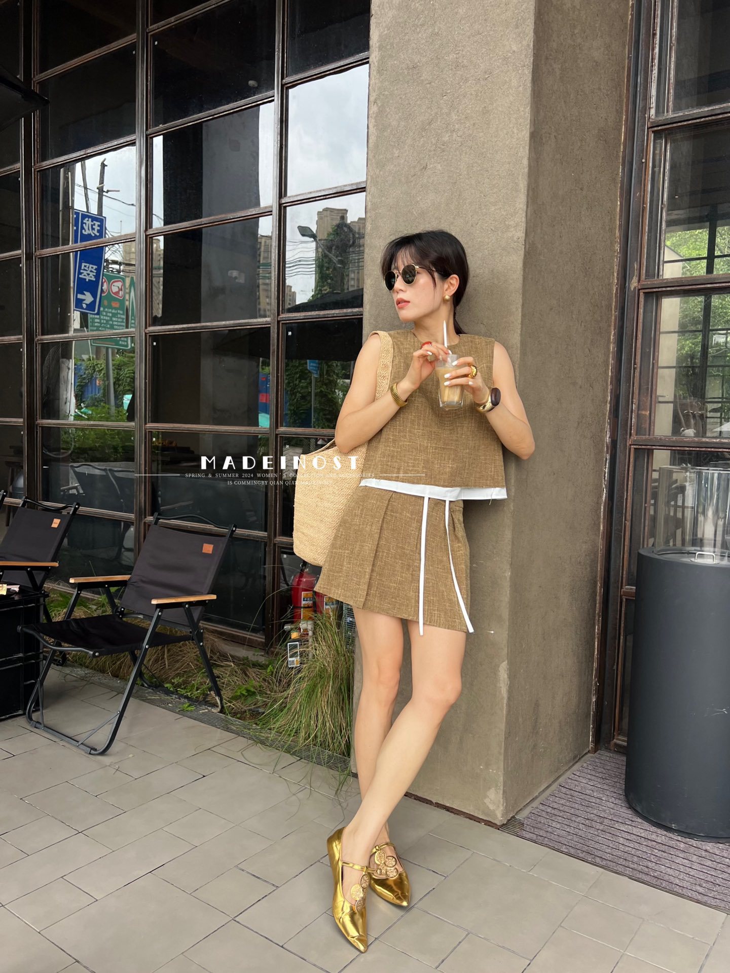 夏季复古麻感拼接撞色背心+半身裙套装高级感两件套