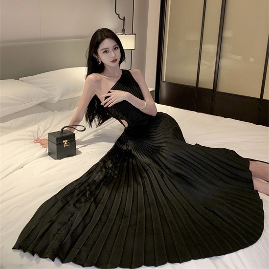 轻奢名媛风单肩腰镂空百褶修身显瘦连衣裙法式设计露肩party礼服