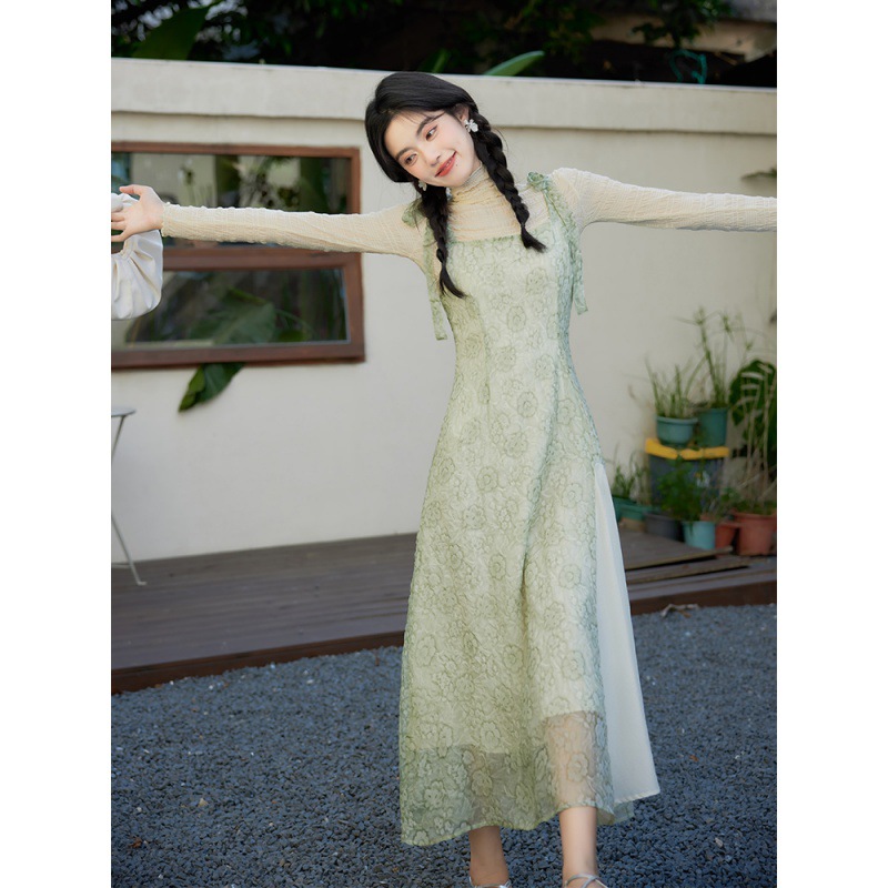 春装女2025年新款绿色碎花吊带连衣裙内搭长袖蕾丝打底衫两件套女