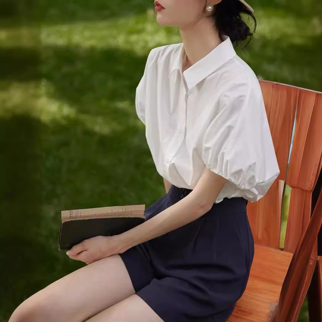 法式白色衬衫夏新款复古设计感泡泡袖别致上衣女