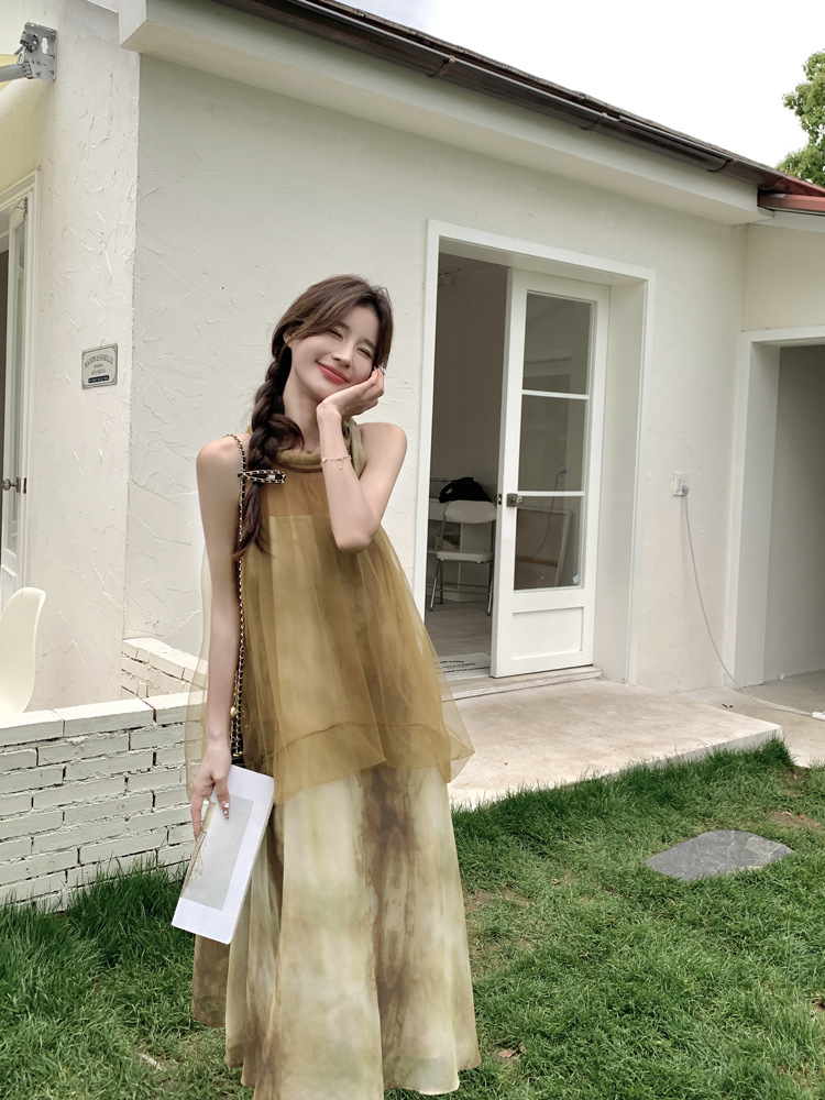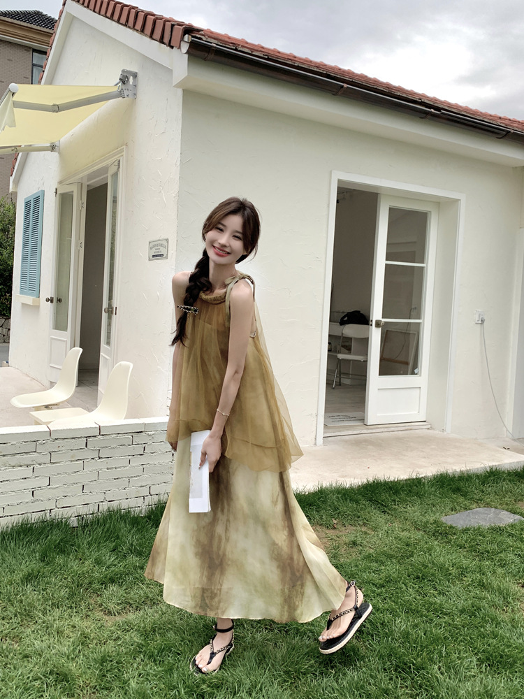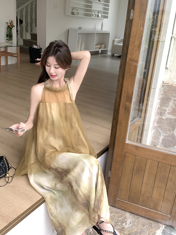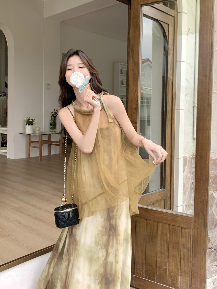 气质挂脖网纱扎染雪纺裙子新中式国风假两件连衣裙女夏季新款仙女
