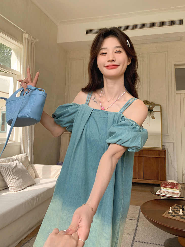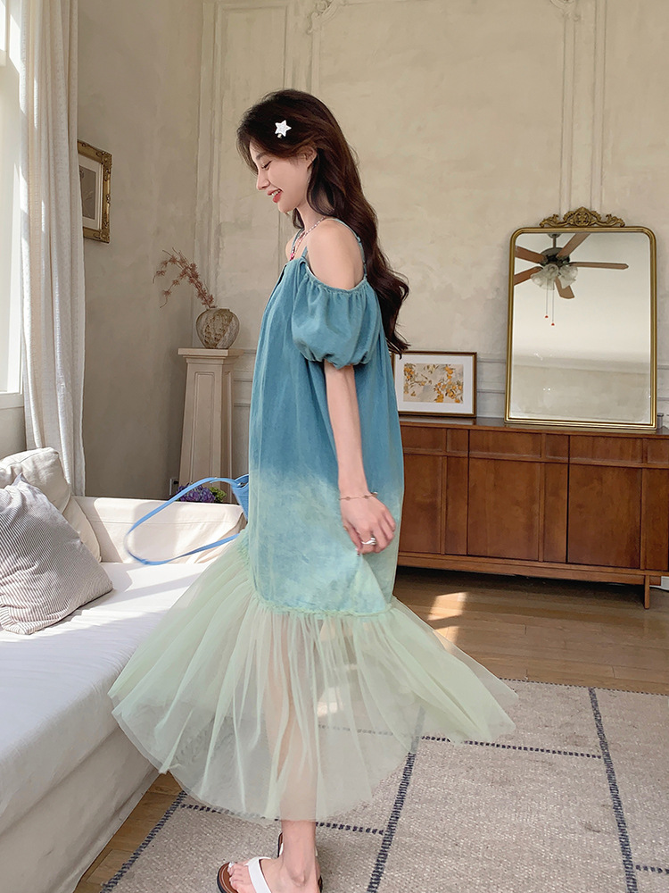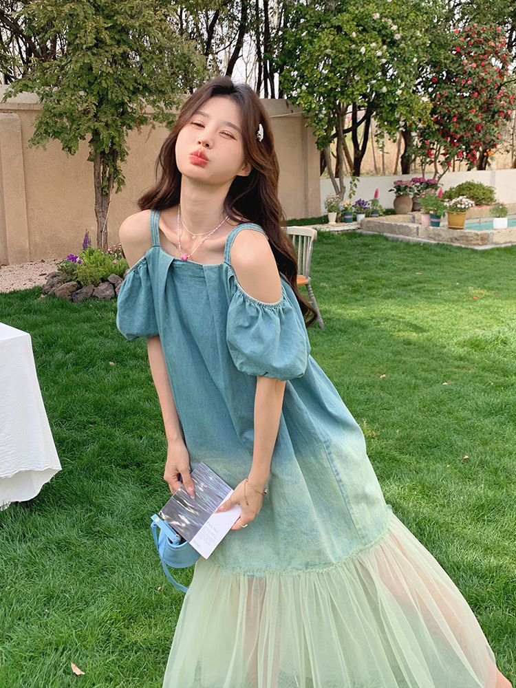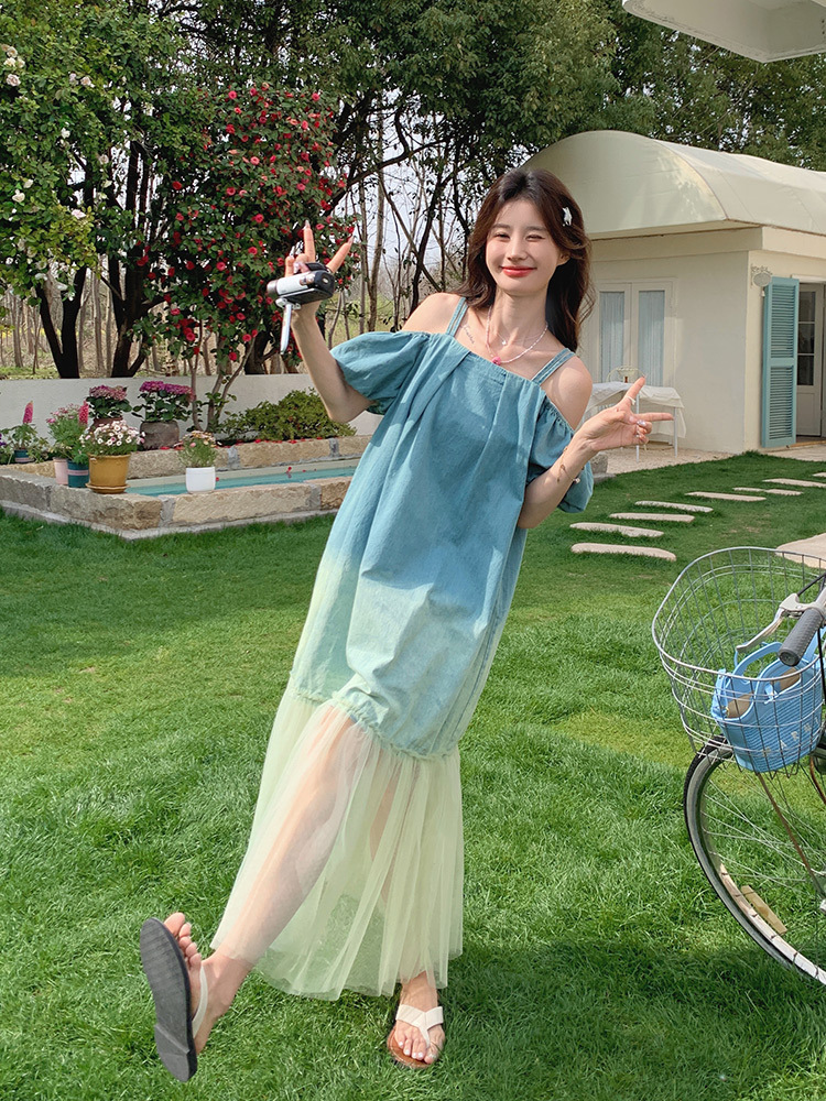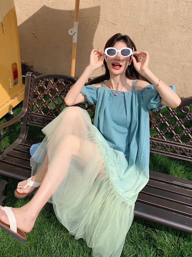 设计感渐变色露肩牛仔连衣裙夏季新款法式绝美网纱拼接度假长裙子