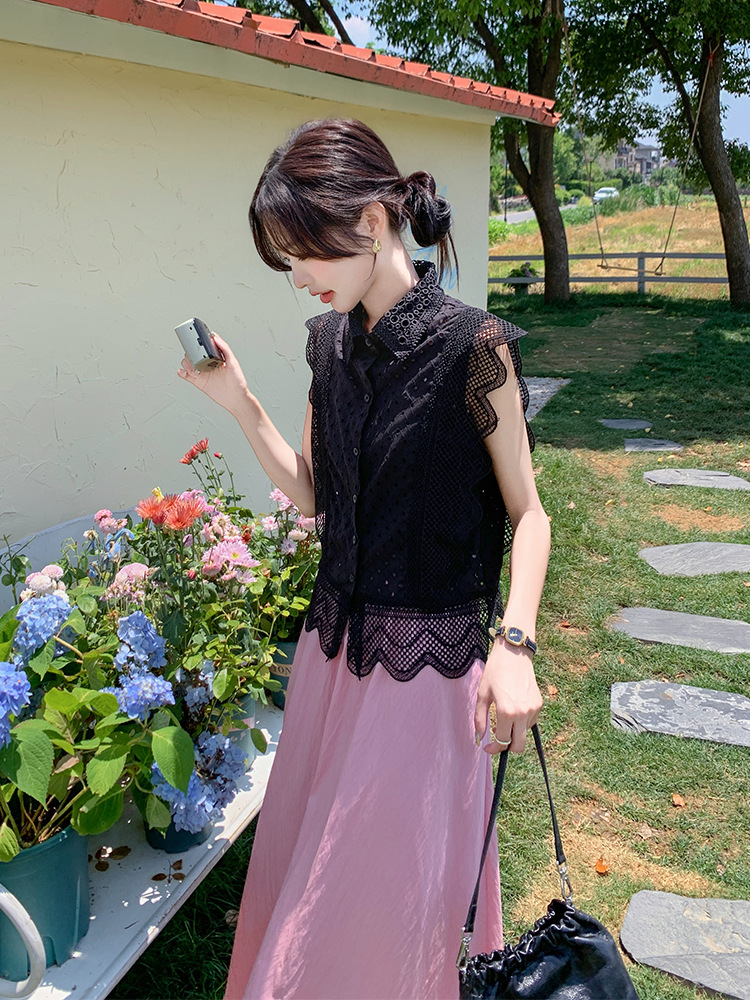 法式复古气质套装女夏季新款高级黑色无袖蕾丝衫半身裙两件套