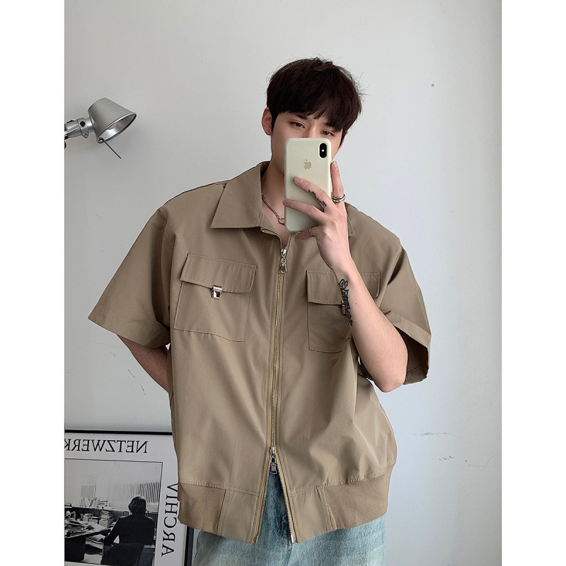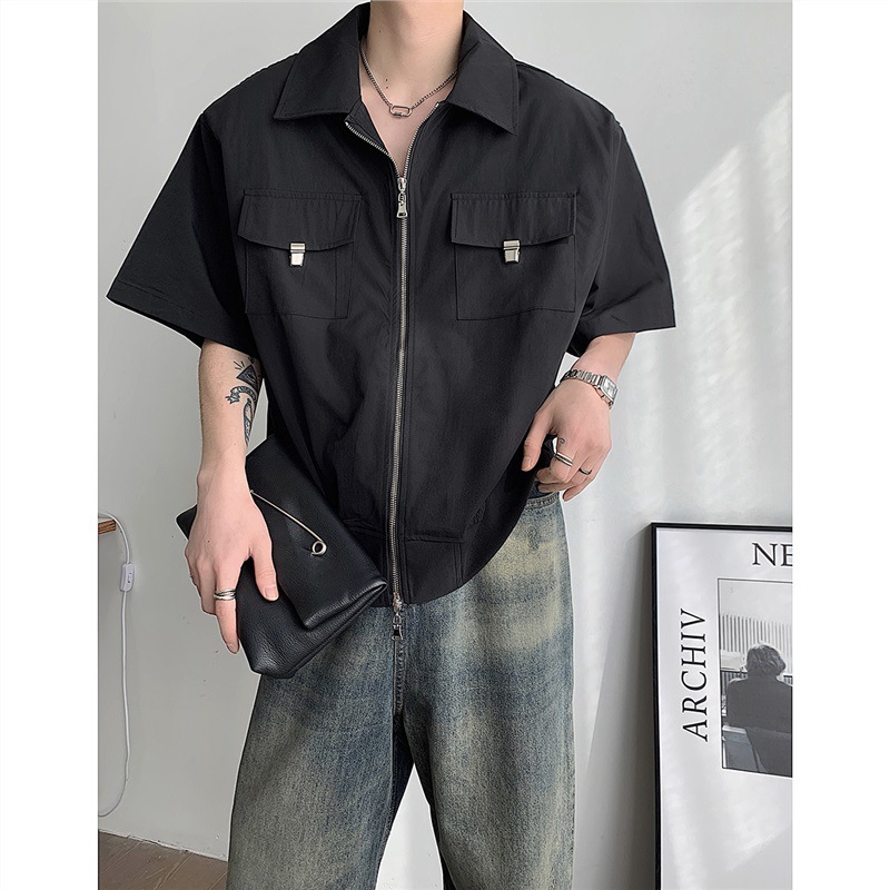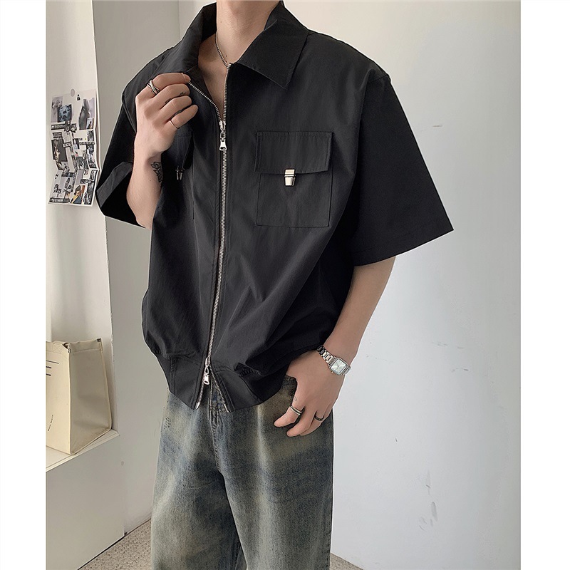 小众短款垫肩短袖夹克男夏季潮流帅气宽松衬衣金属设计感工装衬衫