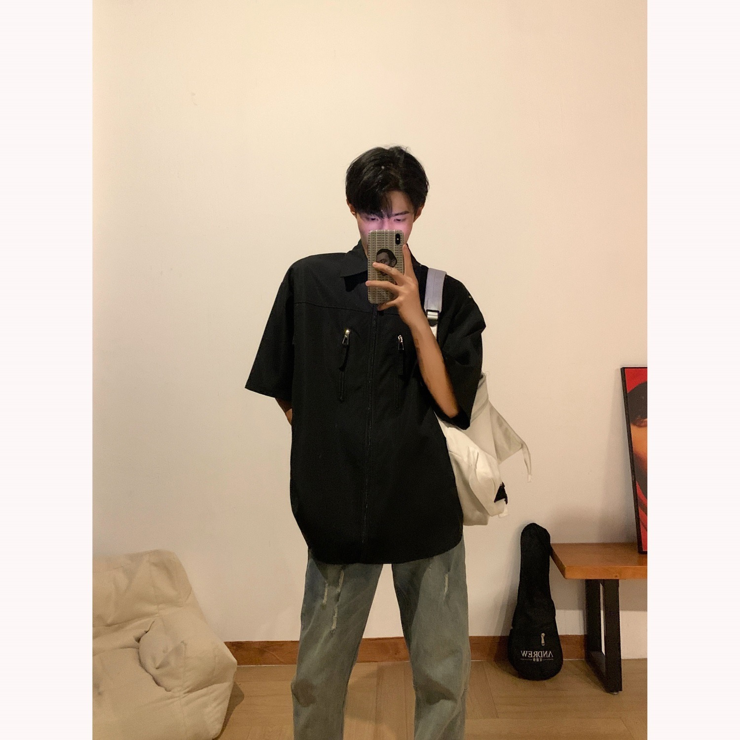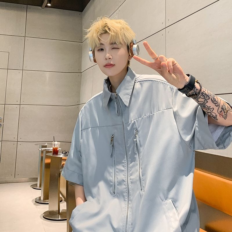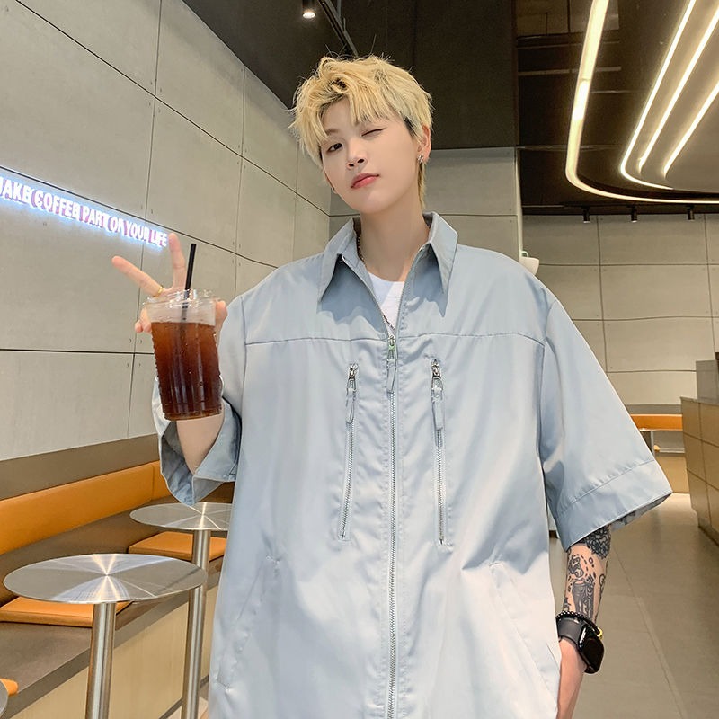 港风短袖衬衫男款夏季新款拉链设计感纯色百搭高街翻领五分袖外套