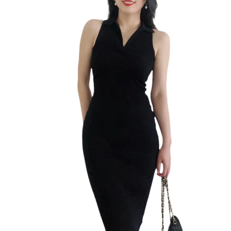 质感垂感赫本夏季新款时尚性感Polo翻领无袖连衣裙收腰过膝中裙