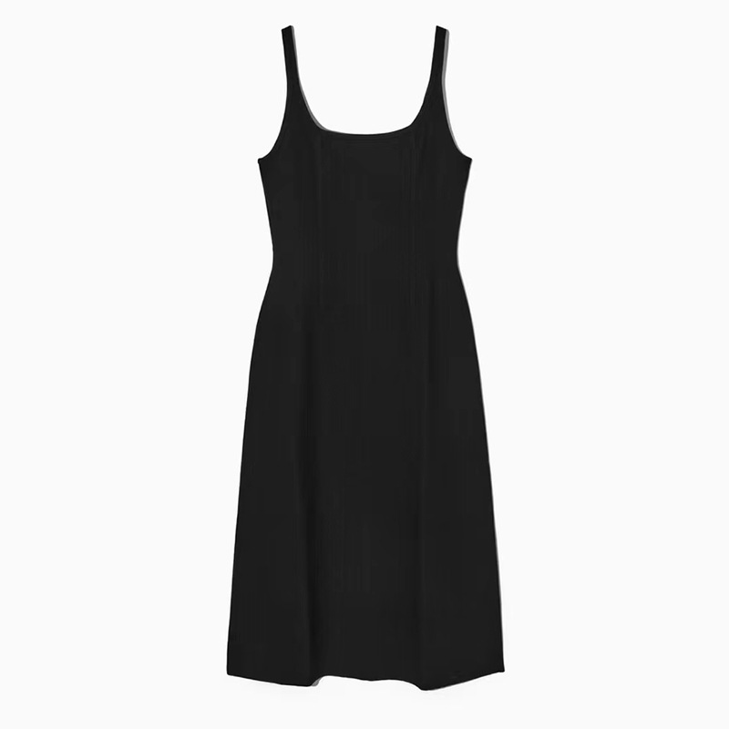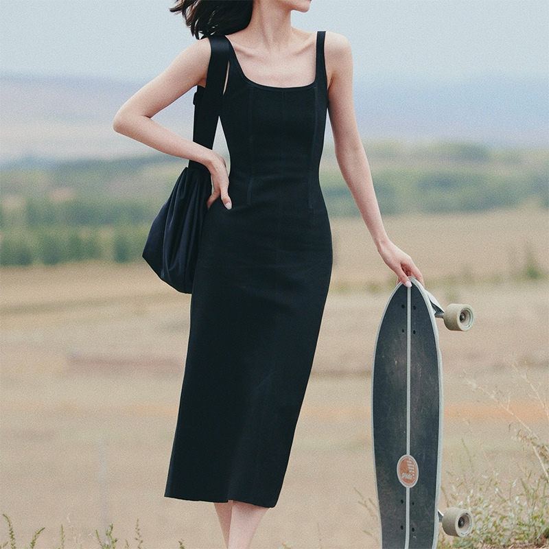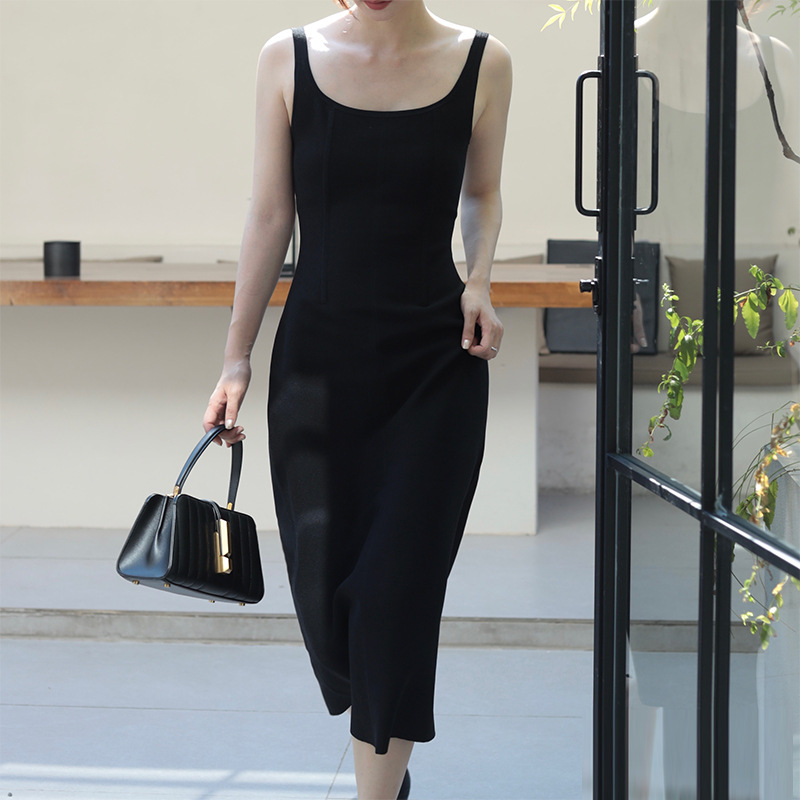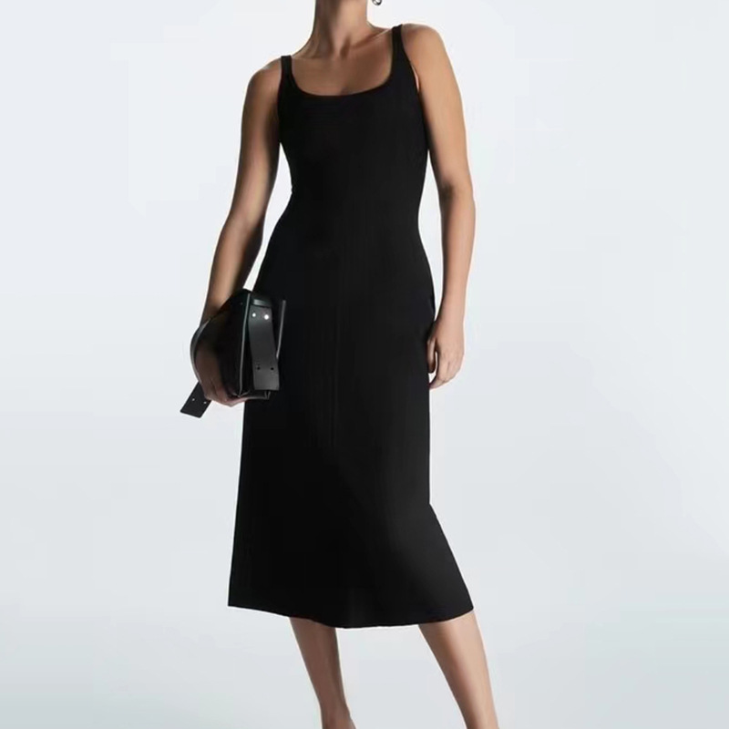 质感垂感夏新款cos风无袖修身收腰大摆裙方领背心针织连衣裙