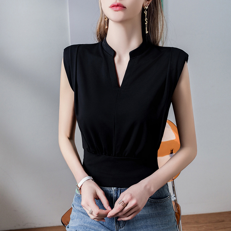 直角肩V领T恤女无袖修身短袖夏季新款纯色甜辣风带肩垫背心