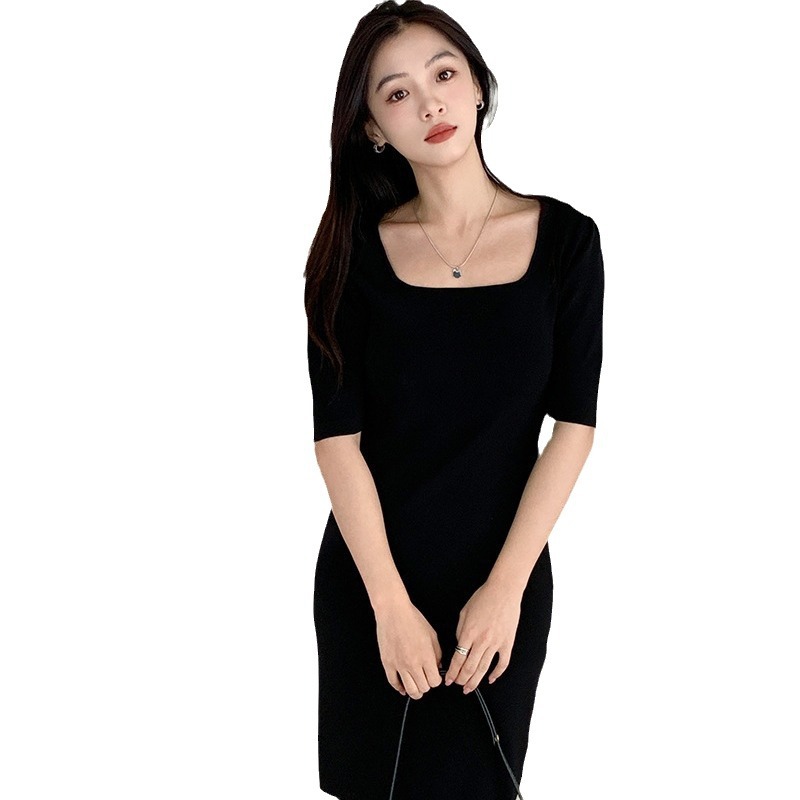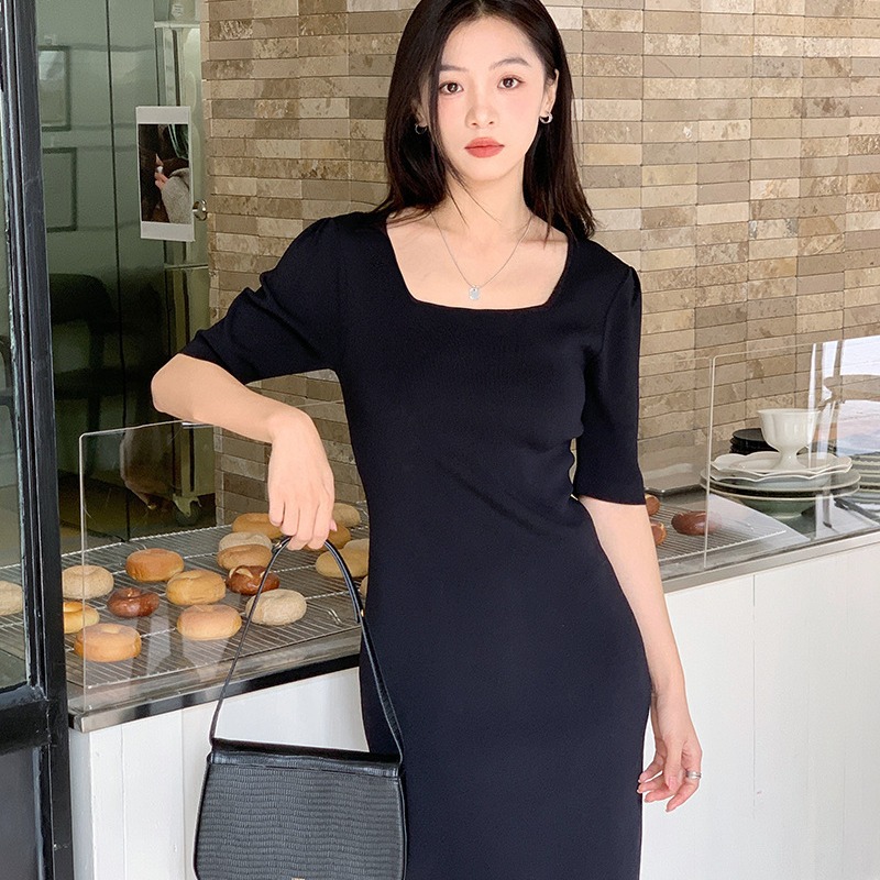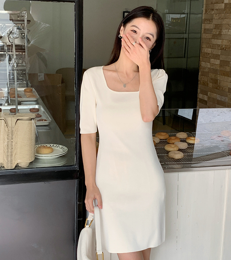 质感面料春夏新款泡泡袖方领连衣裙气质修身中袖针织