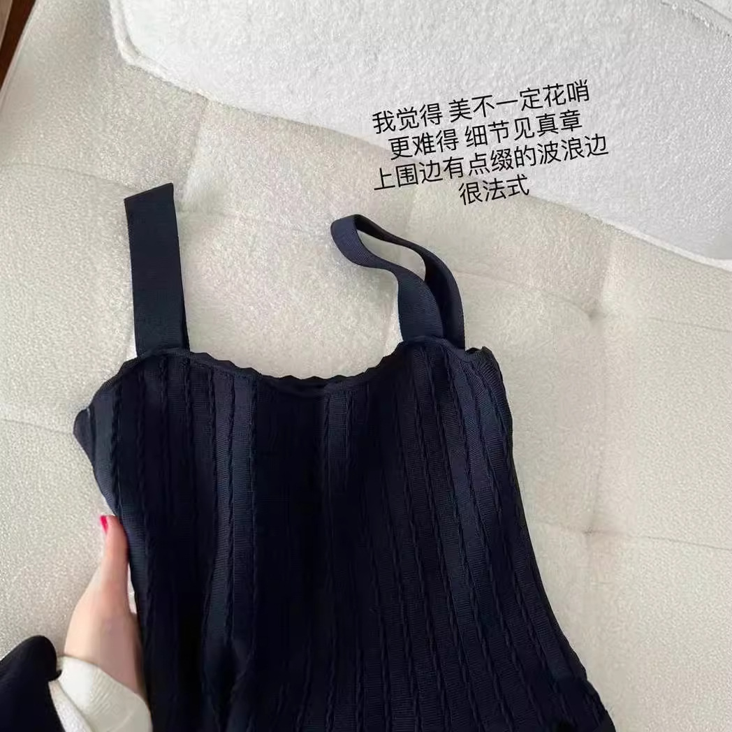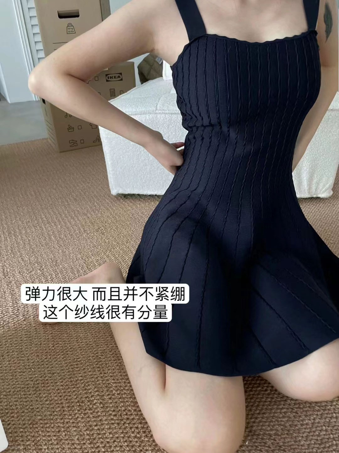 高品质波点肌理方领吊带针织裙收腰修身显瘦小黑裙大摆裙夏
