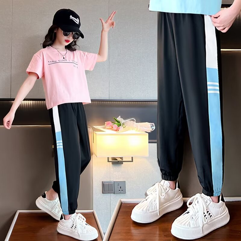 女童阔腿裤夏季薄款儿童冰丝裤子大童夏装运动裤女孩夏天长裤套装