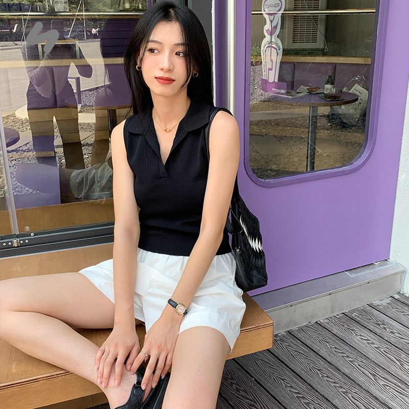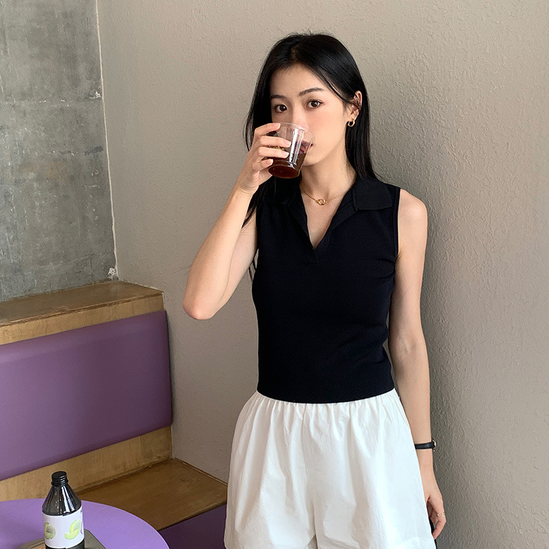 冰凉感显瘦时尚外穿Polo领正肩套头无袖针织马甲背心女