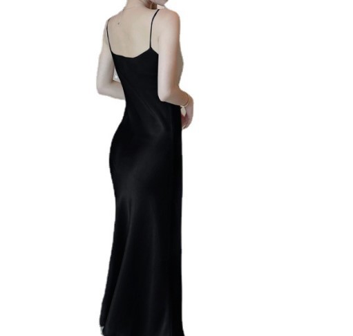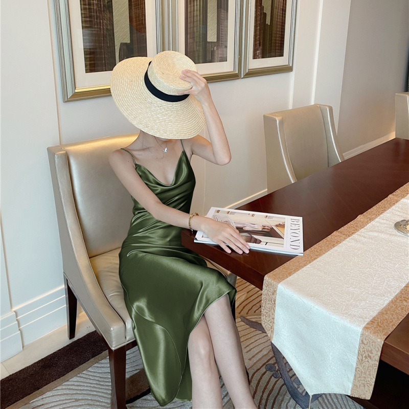 夏季新款法式气质醋酸缎面荡领性感吊带连衣裙女夏