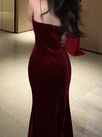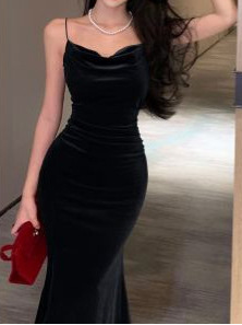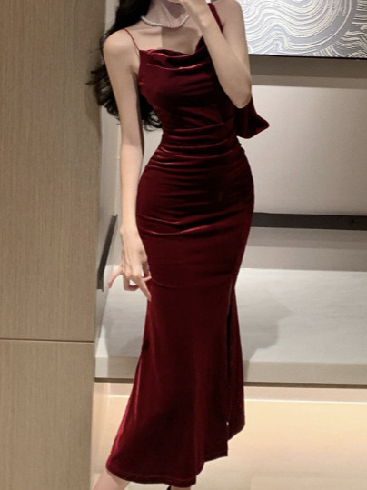 夏季高级感法式复古丝绒收腰紧身显瘦开叉包臀吊带裙内搭长裙
