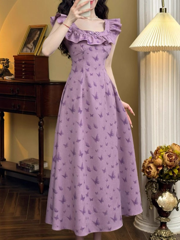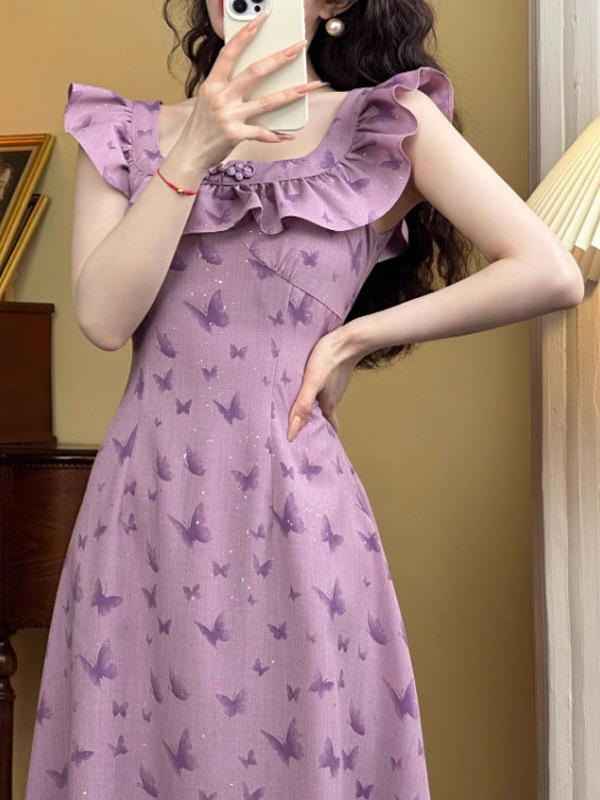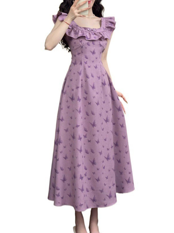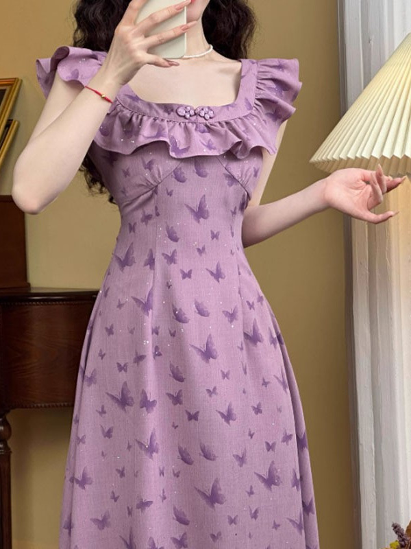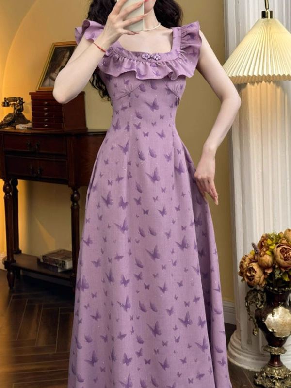 夏季新款法式气质荷叶边紫色蝴蝶方领吊带连衣裙女