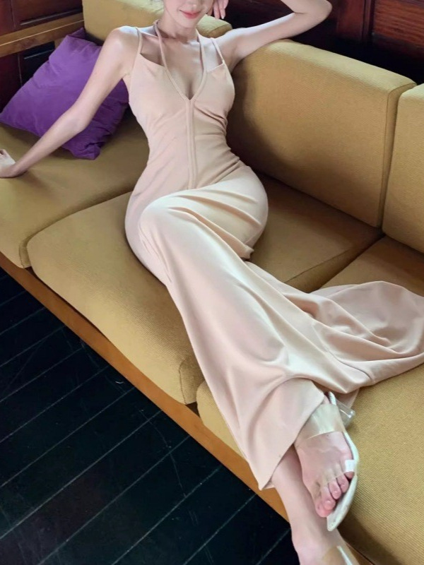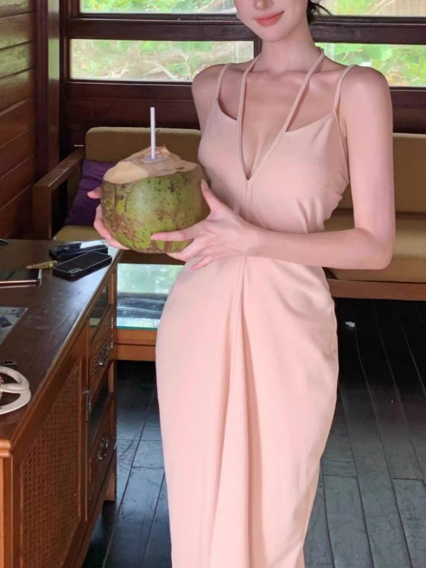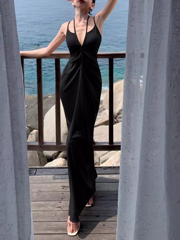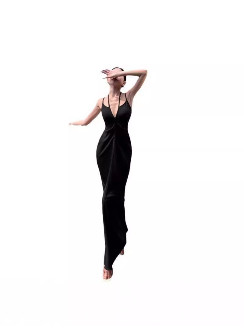 夏季新款法式气质深V垂坠收腰立裁挂脖露背吊带长款连衣裙