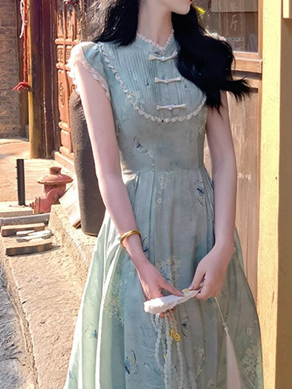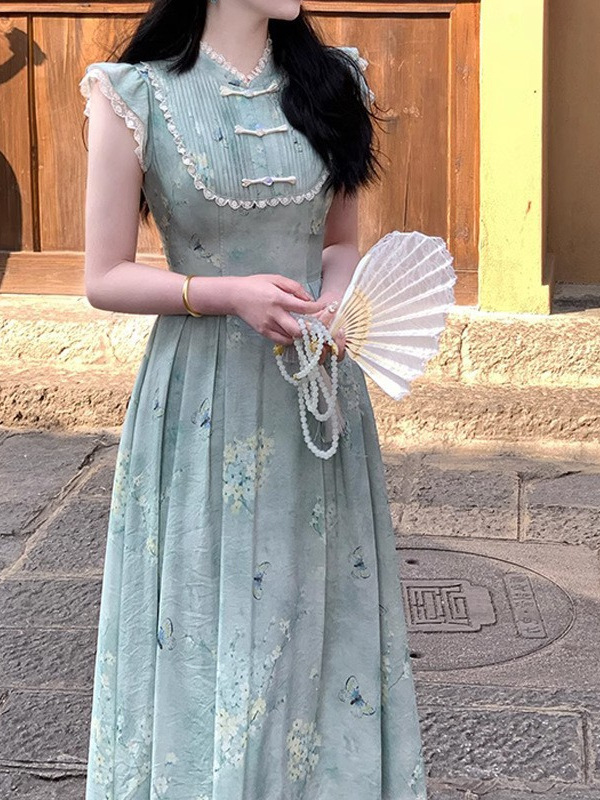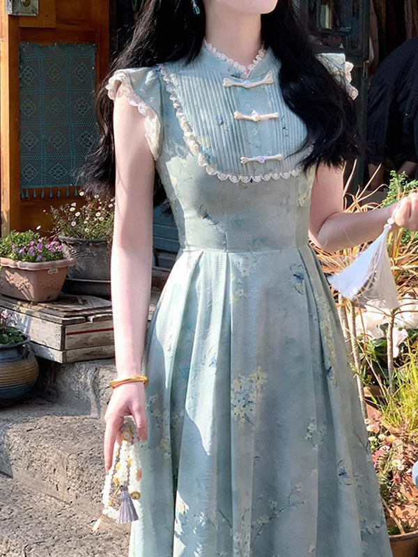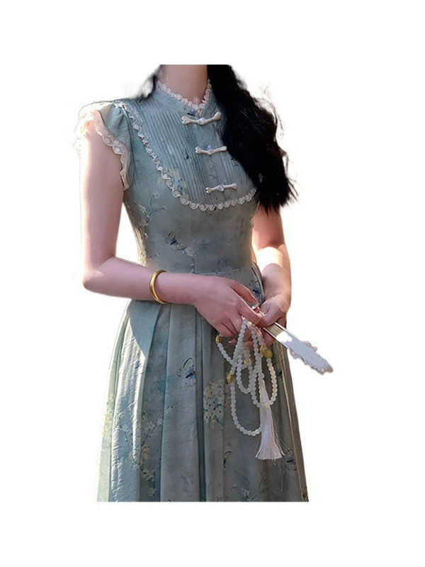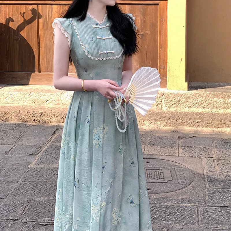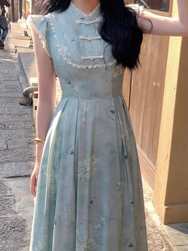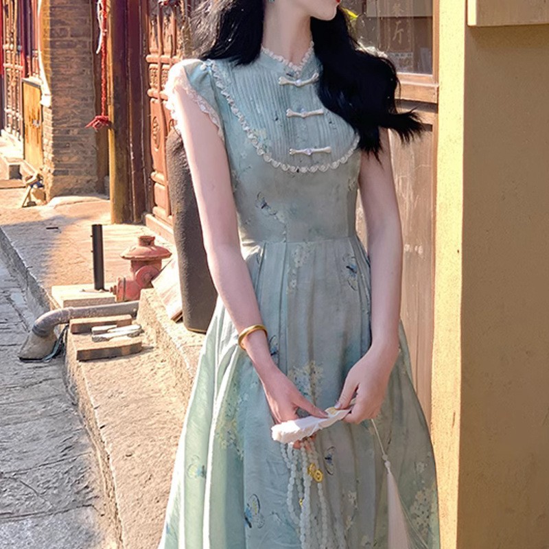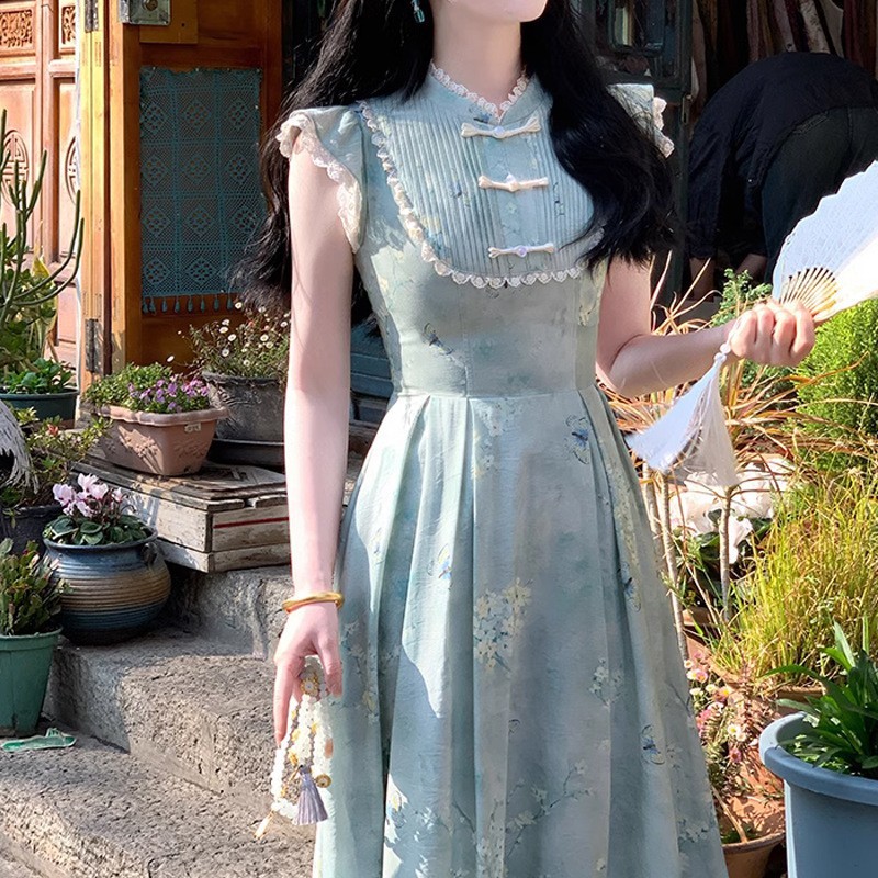 改良新中式盘扣旗袍领小飞袖收腰印花夏款连衣裙女