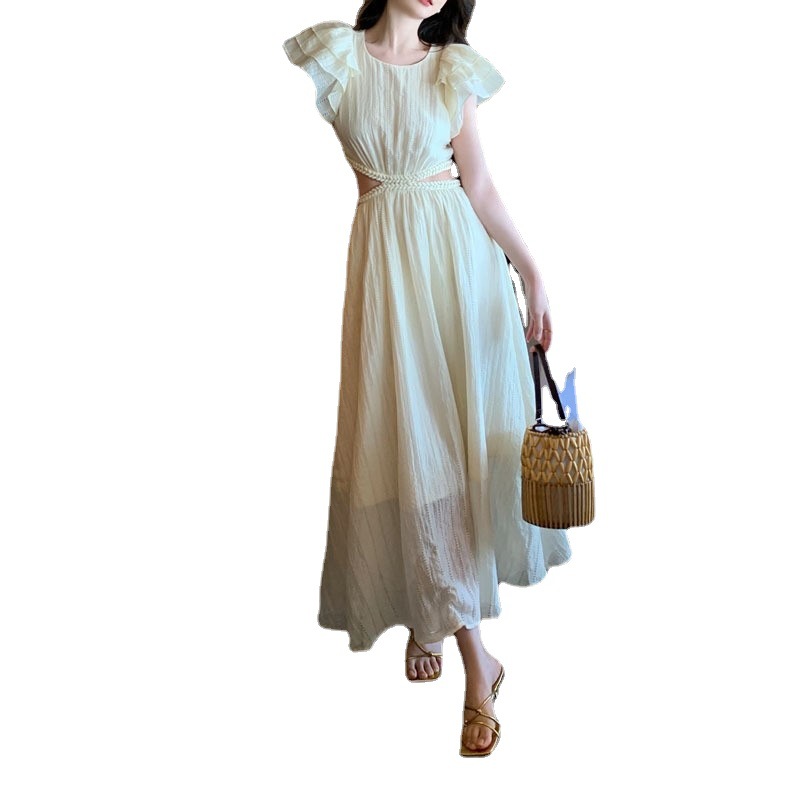 新款夏季 镂空露腰海边度假飞飞袖连衣裙设计感夏季
