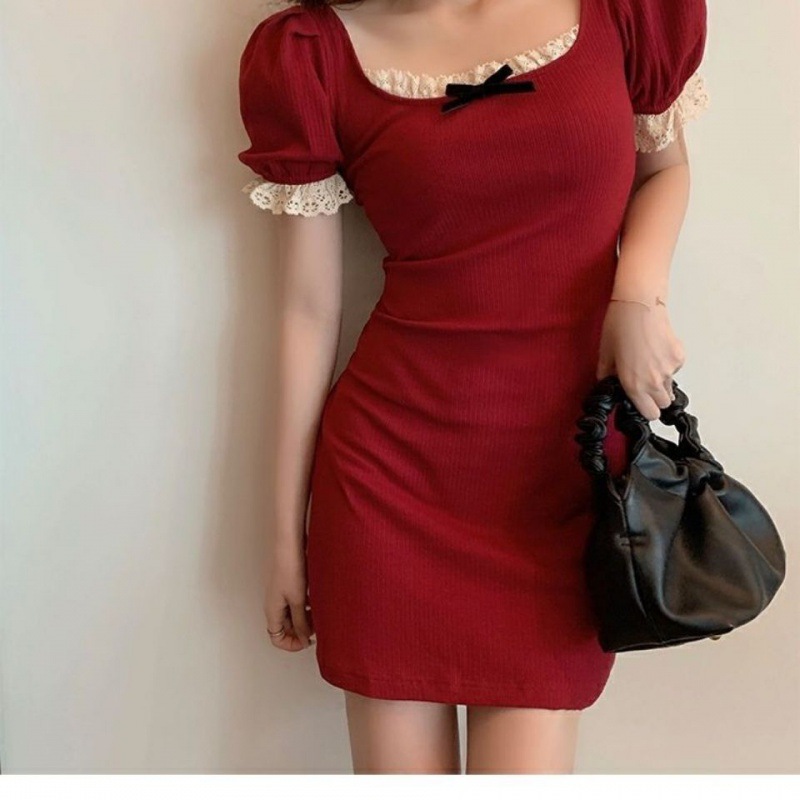 连衣裙女春夏新款方领法式复古设计感小众小个子气质修身裙子