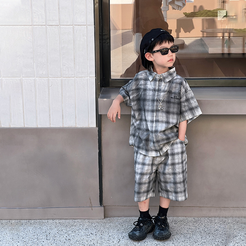 男童短袖套装夏季新品童装韩版儿童宽松格子衬衫短裤两件套潮